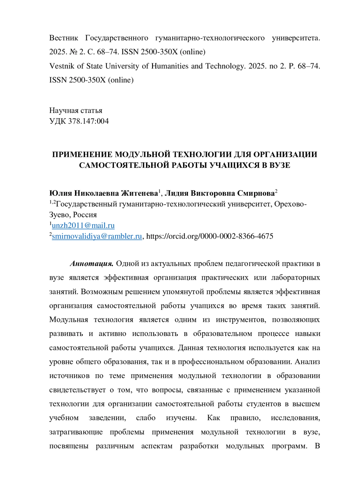 1. Бариленко И.А. Перспективы применения педагогической технологии модульного обучения // Язык и культура. 2022. № 57. С. 157-180.
