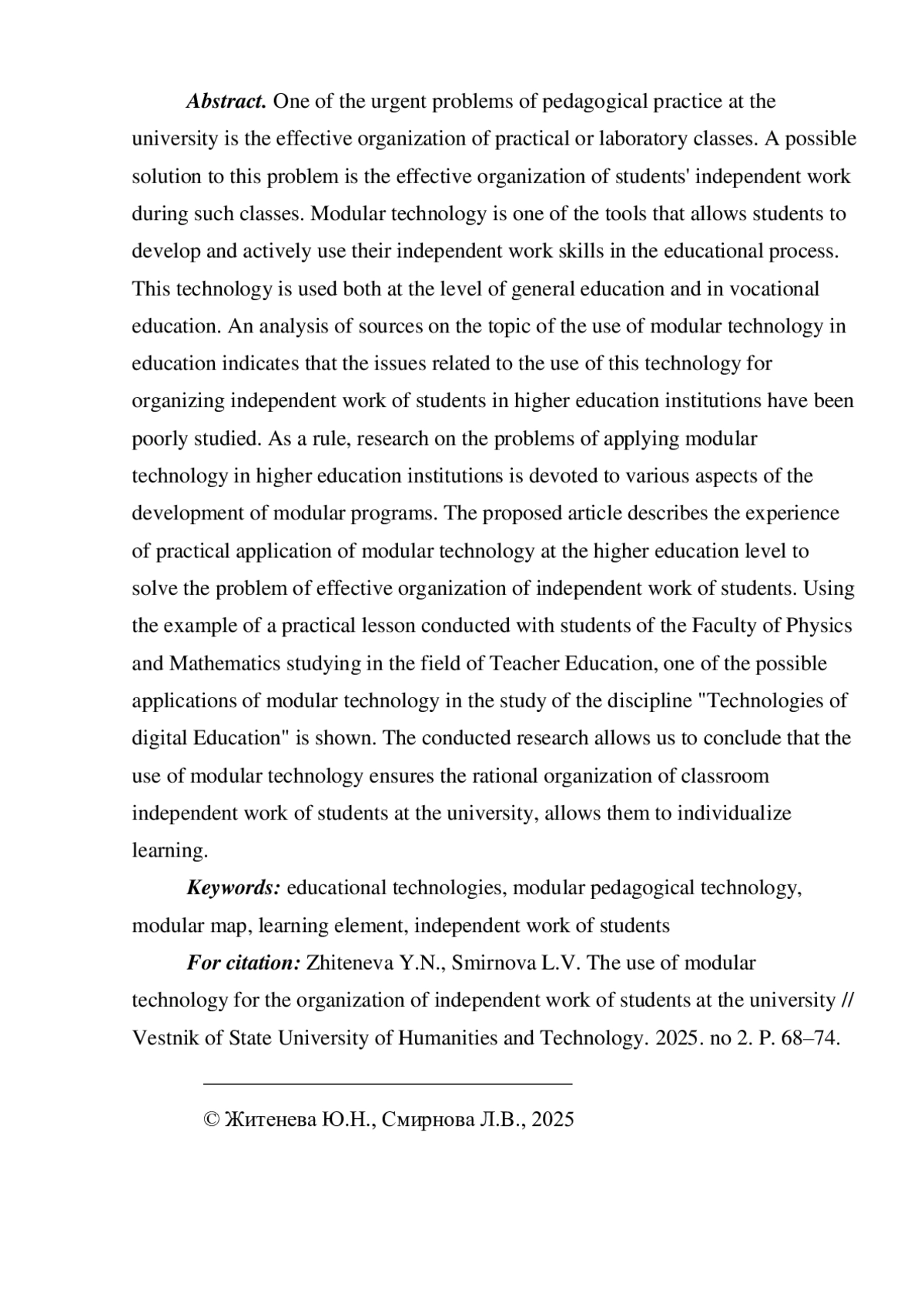 Одной из актуальных проблем педагогической практики в вузе является эффективная организация практических или лабораторных занятий. Возможным решением упомянутой проблемы является эффективная организация самостоятельной работы учащихся во время таких занятий. Модульная технология является одним из инструментов, позволяющих развивать и активно использовать в образовательном процессе навыки самостоятельной работы учащихся. Данная технология используется как на уровне общего образования, так и в профессиональном образовании. Анализ источников по теме применения модульной технологии в образовании свидетельствует о том, что вопросы, связанные с применением указанной технологии для организации самостоятельной работы студентов в высшем учебном заведении, слабо изучены. Как правило, исследования, затрагивающие проблемы применения модульной технологии в вузе, посвящены различным аспектам разработки модульных программ. В предлагаемой статье описан опыт практического применения модульной технологии на ступени высшего образования для решения проблемы эффективной организации самостоятельной работы учащихся. На примере практического занятия, проведенного со студентами физико-математического факультета, обучающимися по направлению «Педагогическое образование», показан один из возможных вариантов применения модульной технологии при изучении дисциплины «Технологии цифрового образования». Проведенные исследования позволяют сделать вывод о том, что применение модульной технологии обеспечивает рациональную организацию аудиторной самостоятельной работы учащихся в вузе, позволяет индивидуализировать обучение.