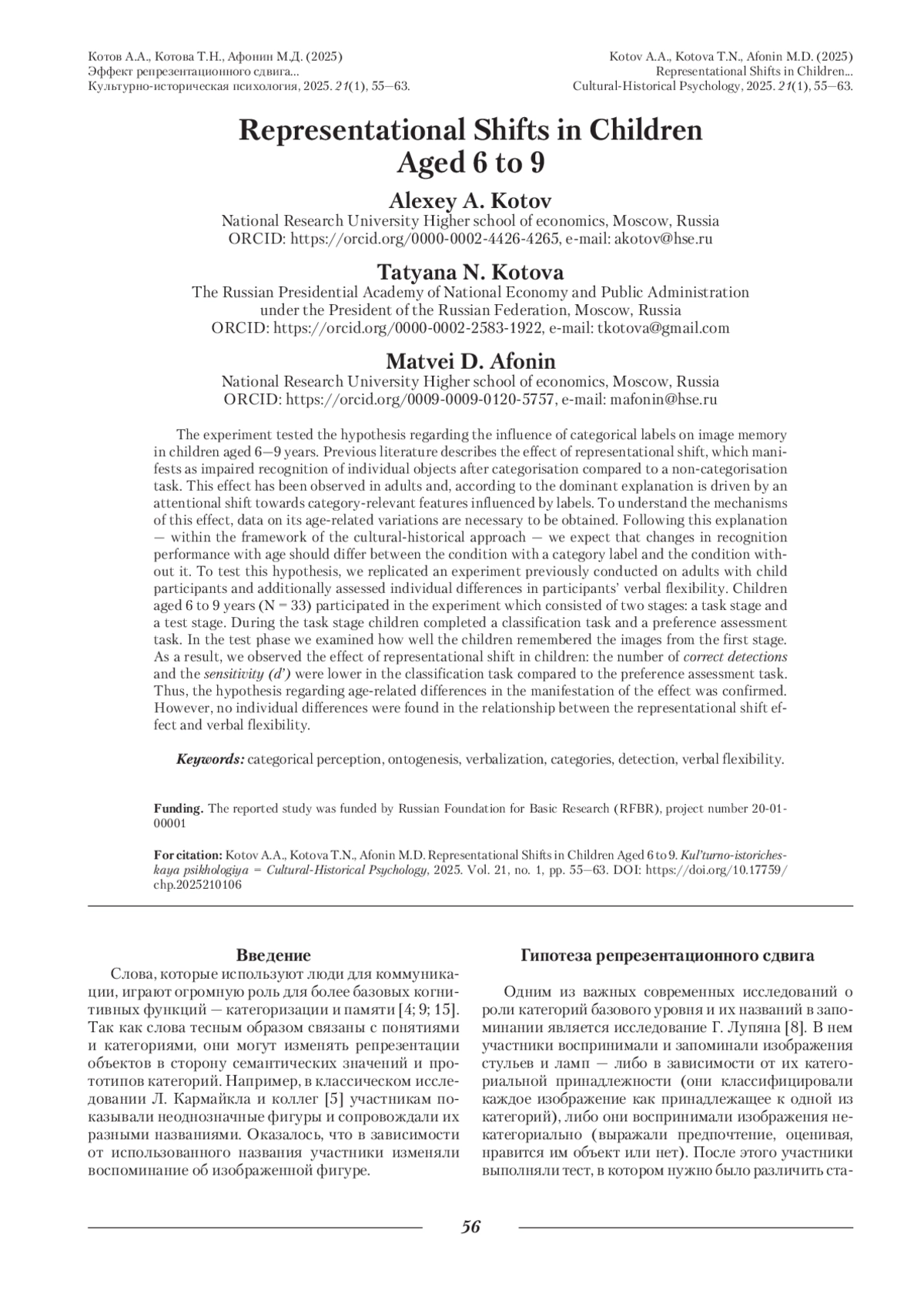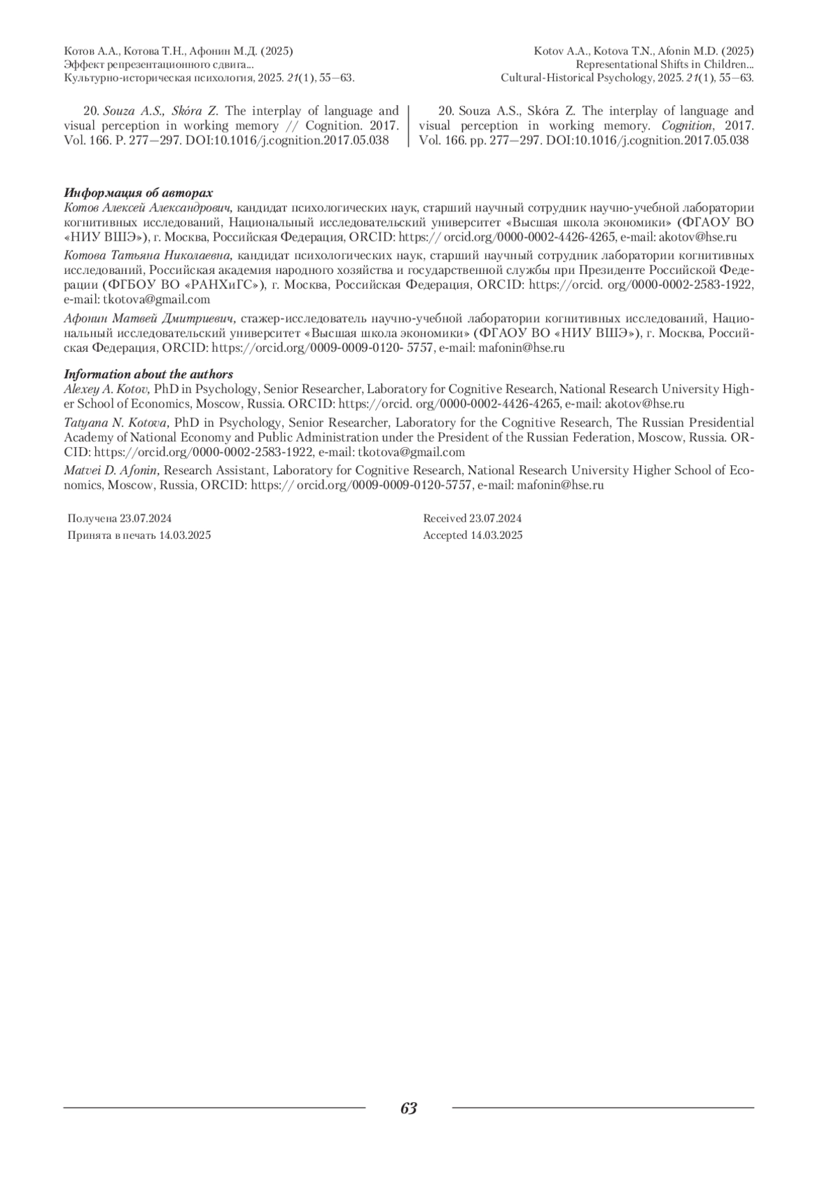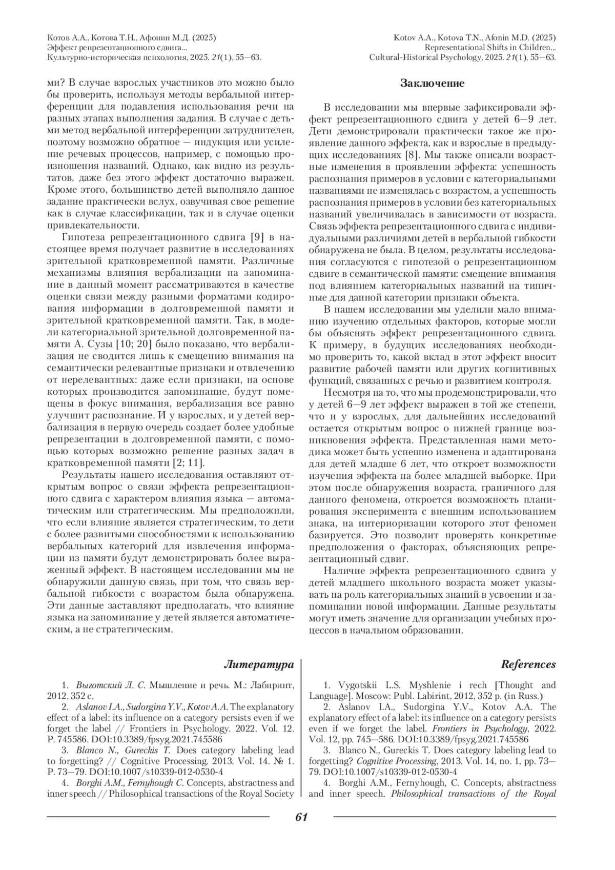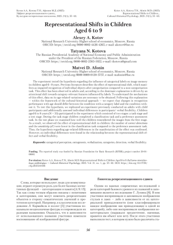 2. Aslanov I.A., Sudorgina Y.V., Kotov A.A. The explanatory effect of a label: its influence on a category persists even if we forget the label // Frontiers in Psychology. 2022. Vol. P. 745586. DOI: 10.3389/fpsyg.2021.745586