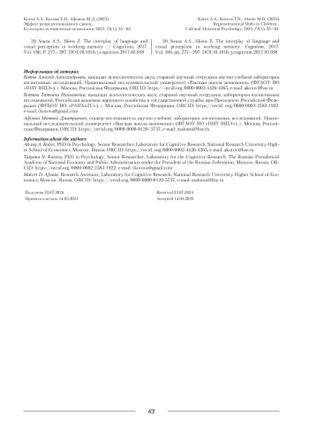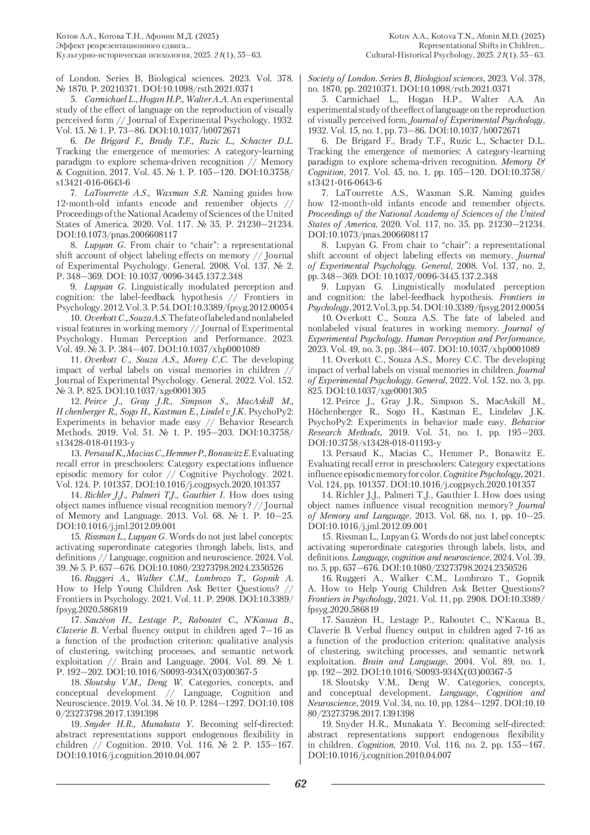 11. Overkott C., Souza A.S., Morey C.C. The developing impact of verbal labels on visual memories in children // Journal of Experimental Psychology. General. 2022. Vol. № 3. P. 825. DOI: 10.1037/xge0001305