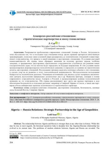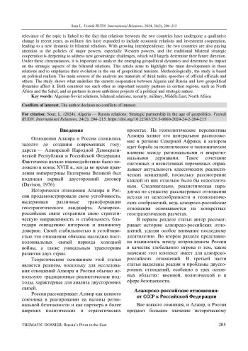 Раскрывается проблематика современных отношений Алжира и России. Актуальность темы обусловлена тем, что в последние годы отношения между двумя странами претерпели качественную трансформацию, поскольку связи в военной сфере расширились до экономических отношений и инвестиционного сотрудничества, что привело к новой динамике в двусторонних отношениях. В условиях растущей взаимозависимости обе страны также обращают внимание на политику крупных держав, особенно западных, и традиционное двустороннее стратегическое сотрудничество углубляется для решения новых геостратегических задач, что во многом будет определять их будущее направление. В этих условиях важно проанализировать формирующуюся геополитическую динамику и определить ее влияние на стратегические аспекты двусторонних отношений. Исследование призвано выделить ключевые события в этих отношениях и сделать упор на их развитие в эпоху геополитической напряженности. Методологически исследование базируется на политическом реализме. Основными источниками для анализа служат материалы аналитических центров, выступления официальных должностных лиц и др. Выявлены факторы, лежащие в основе современного сотрудничества между Алжиром и Россией, и проанализировано влияние геополитической динамики на это сотрудничество. Обе страны рассматривают друг друга как важных партнеров в деле обеспечения безопасности в отдельных регионах, например в Северной Африке и Сахеле, а также как партнеров в более амбициозных проектах политического и стратегического характера.