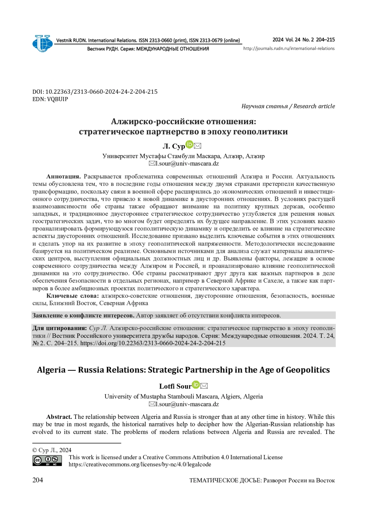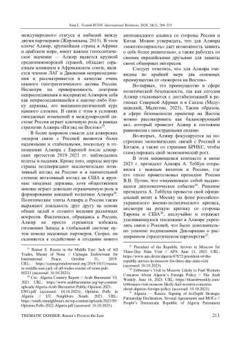 15. Mousli M. Algerian-Russian Cooperation: True Strategic Partnership? // Vestnik RUDN. International Relations. 2019. Vol. 19, no. 2. P. 284-292. ;. DOI: 10.22363/2313-0660-2019-19-2-284-292 EDN: EPQMVH