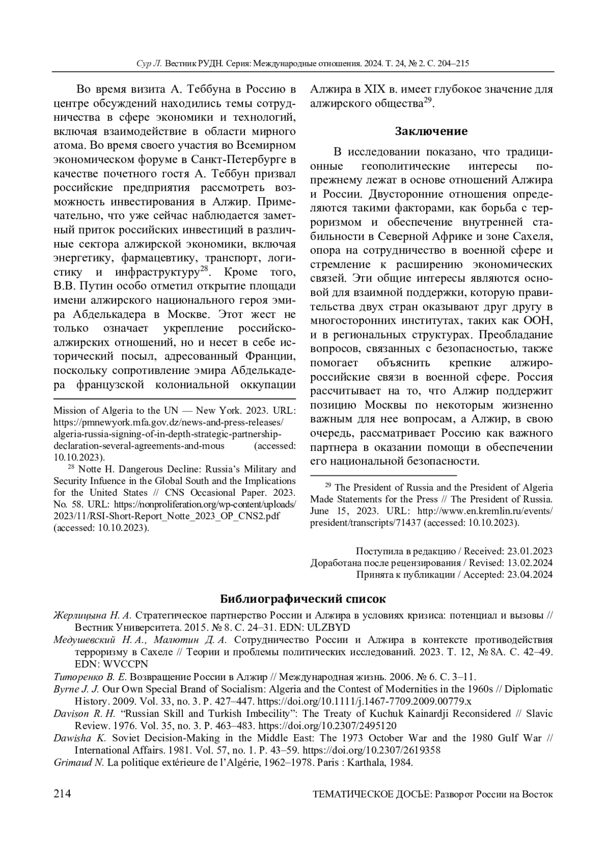 1. Жерлицына Н. А. Стратегическое партнерство России и Алжира в условиях кризиса: потенциал и вызовы // Вестник Университета. 2015. № 8. С. 24-31. EDN: ULZBYD