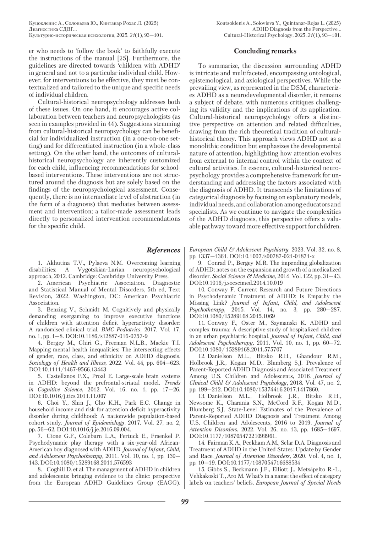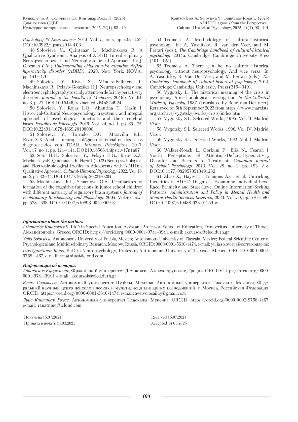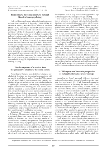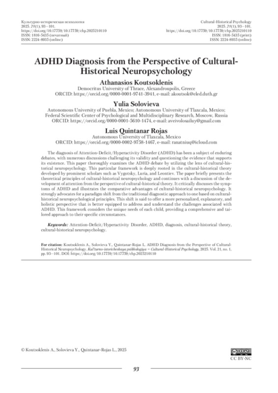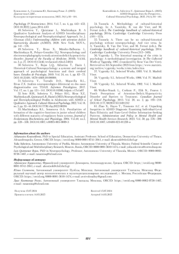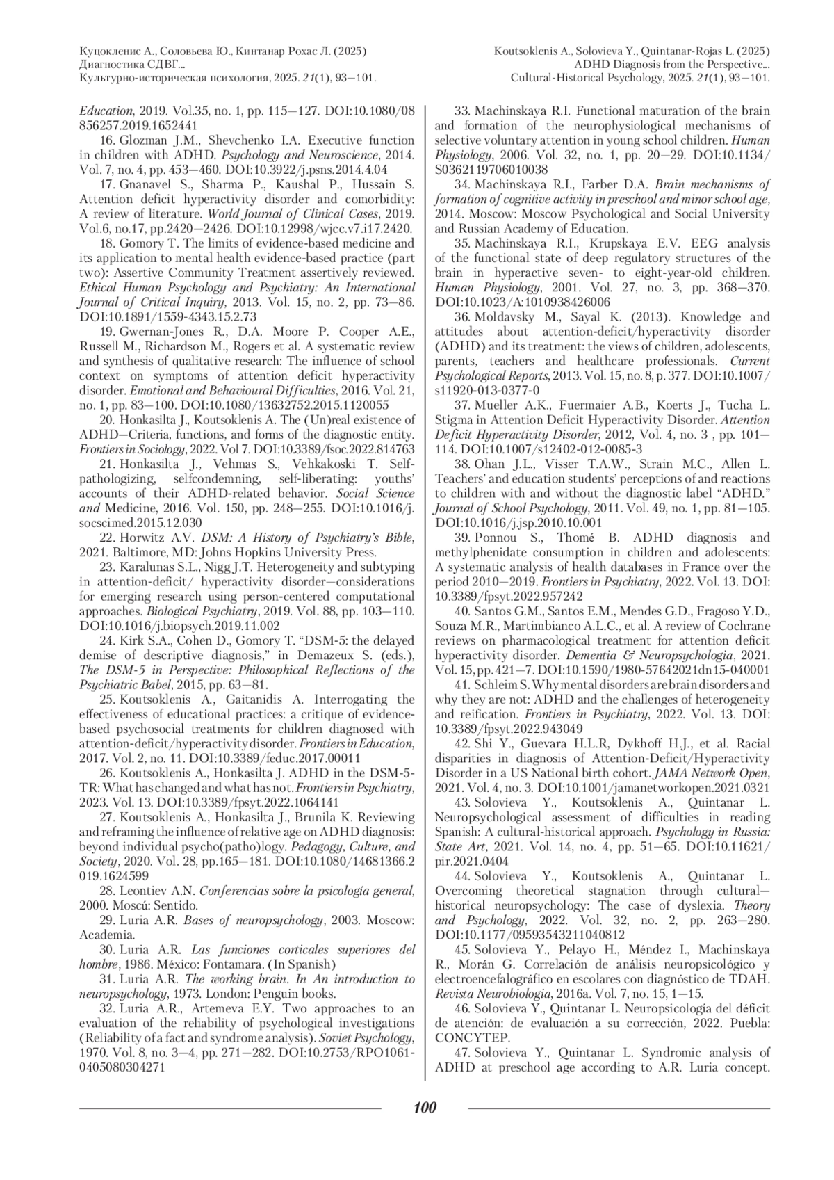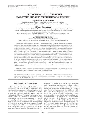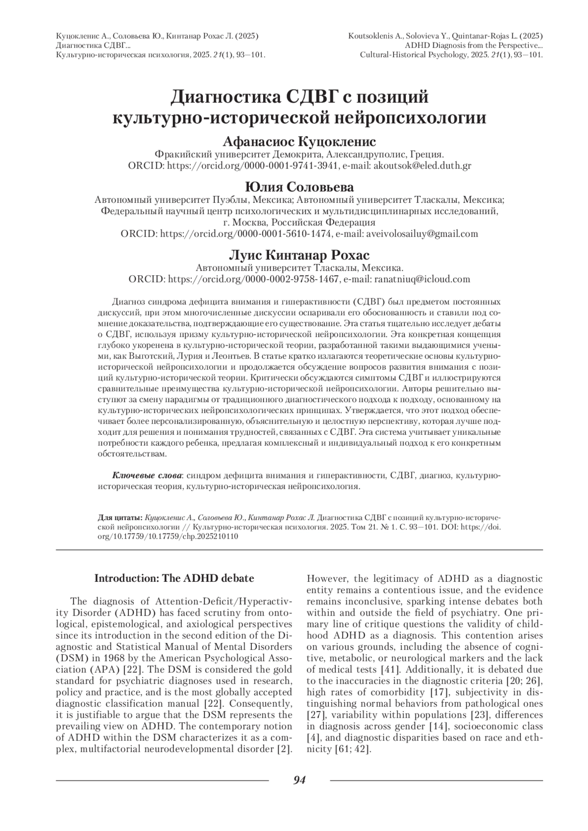 АФАНАСИОС К., СОЛОВЬЕВА Ю., РОХАС Л. К. ДИАГНОСТИКА СДВГ С ПОЗИЦИЙ КУЛЬТУРНО-ИСТОРИЧЕСКОЙ НЕЙРОПСИХОЛОГИИ // КУЛЬТУРНО-ИСТОРИЧЕСКАЯ ПСИХОЛОГИЯ. 2025. № 1, ТОМ 21