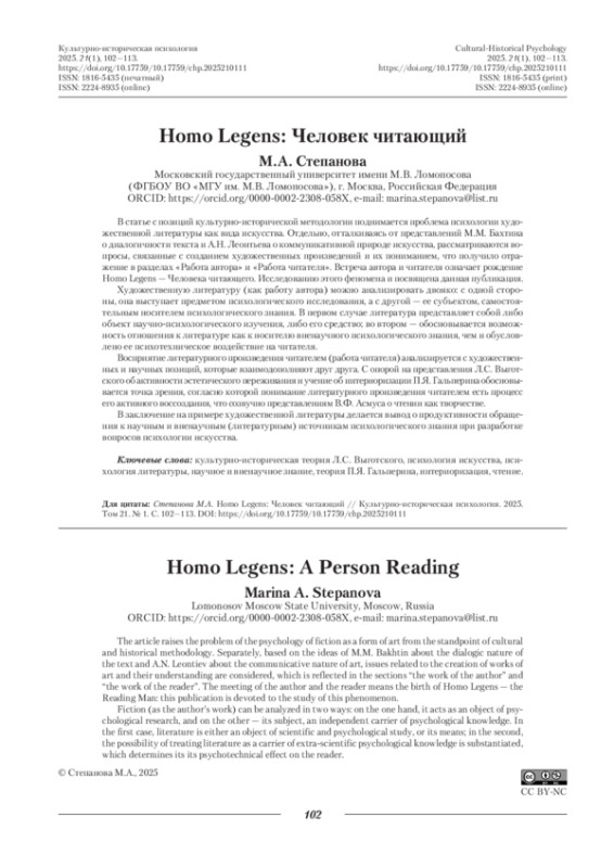 В статье с позиций культурно-исторической методологии поднимается проблема психологии художественной литературы как вида искусства. Отдельно, отталкиваясь от представлений М. М. Бахтина о диалогичности текста и А. Н. Леонтьева о коммуникативной природе искусства, рассматриваются вопросы, связанные с созданием художественных произведений и их пониманием, что получило отражение в разделах «Работа автора» и «Работа читателя». Встреча автора и читателя означает рождение Homo Legens — Человека читающего. Исследованию этого феномена и посвящена данная публикация.