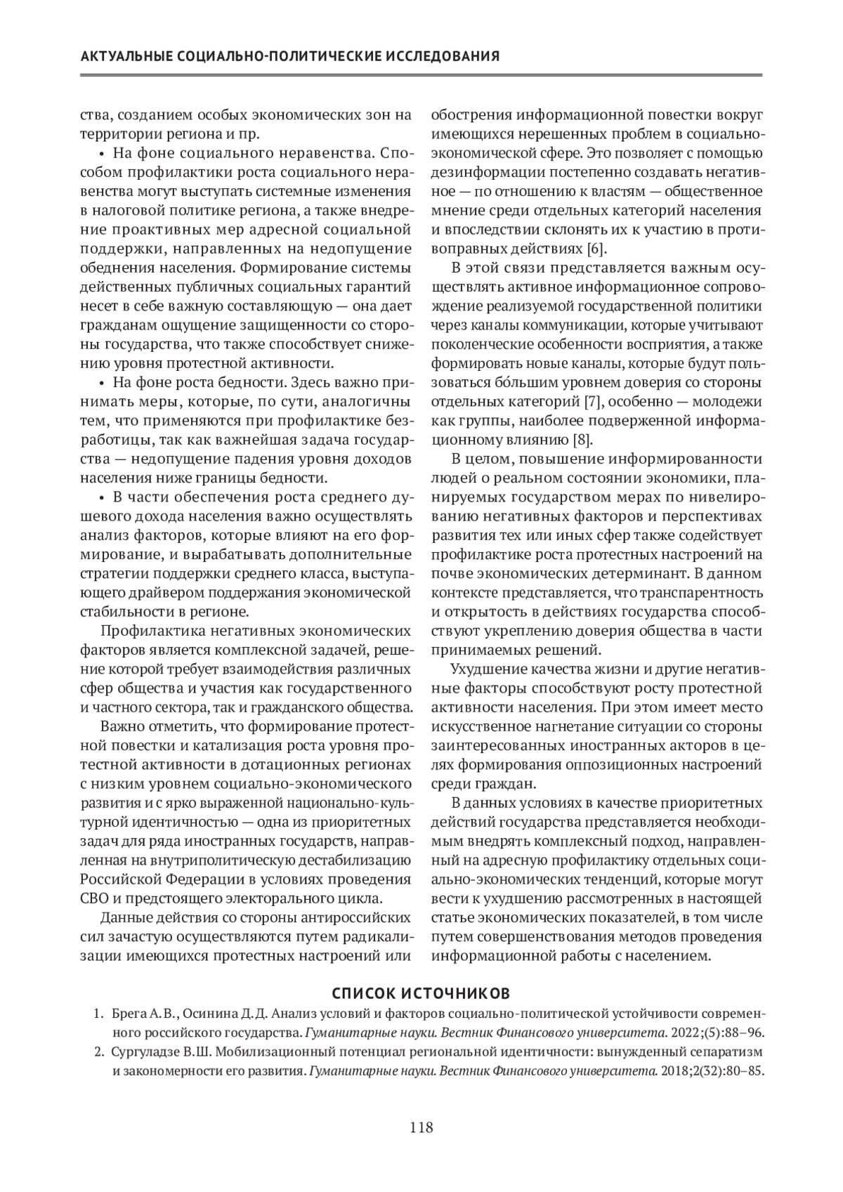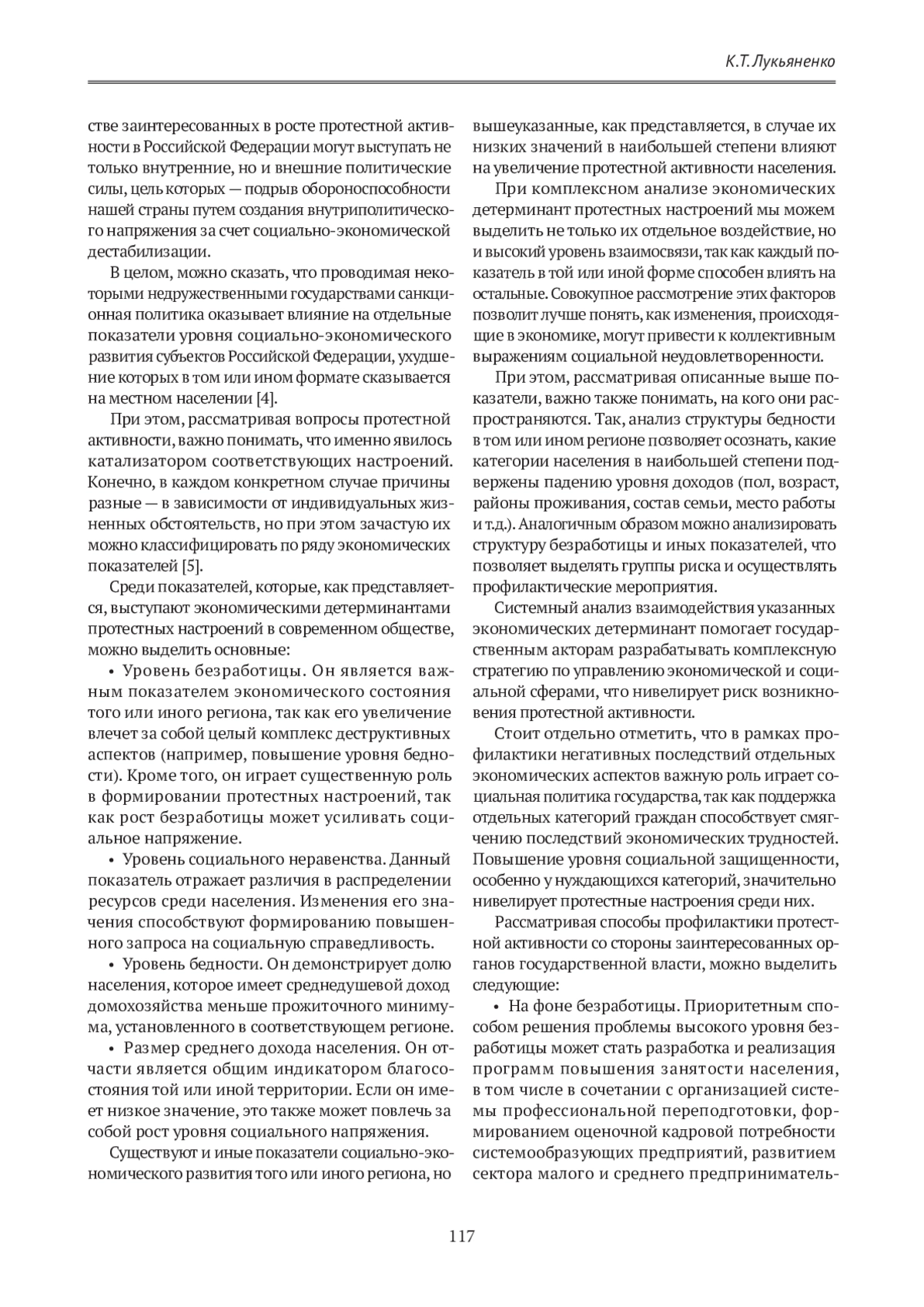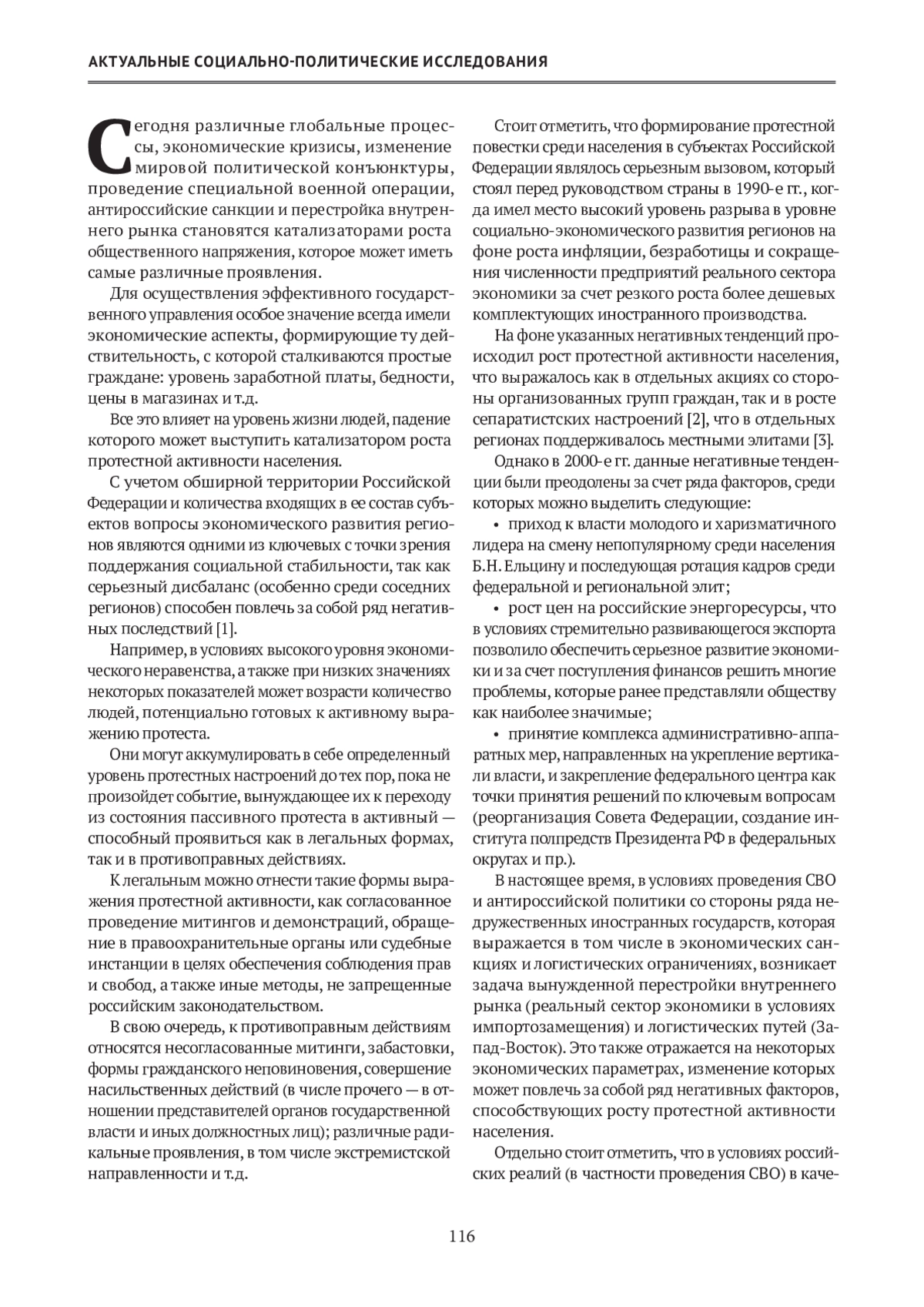 В условиях текущих экономических и политических реалий все бо́льшую актуальность приобретают вопросы, связанные с детерминантами протестных настроений в обществе, которые могут служить инструментом мобилизации протестной активности со стороны заинтересованных политических акторов. Данные проблемы приобретают особую значимость в условиях проведения СВО. Статья посвящена изучению некоторых экономических аспектов, которые способны оказывать влияние на формирование и развитие протестных настроений в российском обществе. Проводится анализ возможной корреляции между отдельными индикаторами уровня социально-экономического развития государства и ростом протестных настроений. Отдельное внимание в работе уделяется анализу потенциальных форм и методов профилактики указанных негативных явлений со стороны государства, которые применяются или могут применяться в будущем.