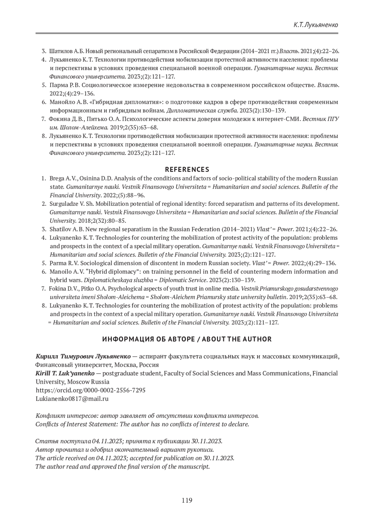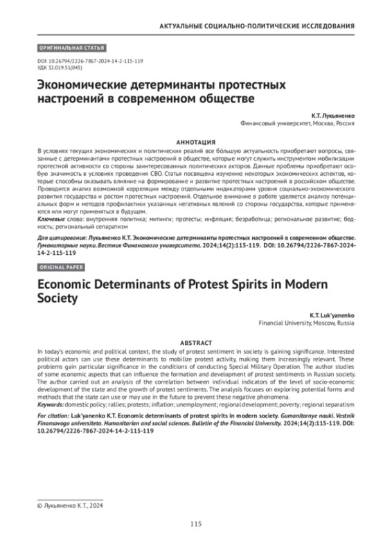 ЛУКЬЯНЕНКО К. Т. ЭКОНОМИЧЕСКИЕ ДЕТЕРМИНАНТЫ ПРОТЕСТНЫХ НАСТРОЕНИЙ В СОВРЕМЕННОМ ОБЩЕСТВЕ // ГУМАНИТАРНЫЕ НАУКИ. ВЕСТНИК ФИНАНСОВОГО УНИВЕРСИТЕТА. 2024. ТОМ 14, № 2