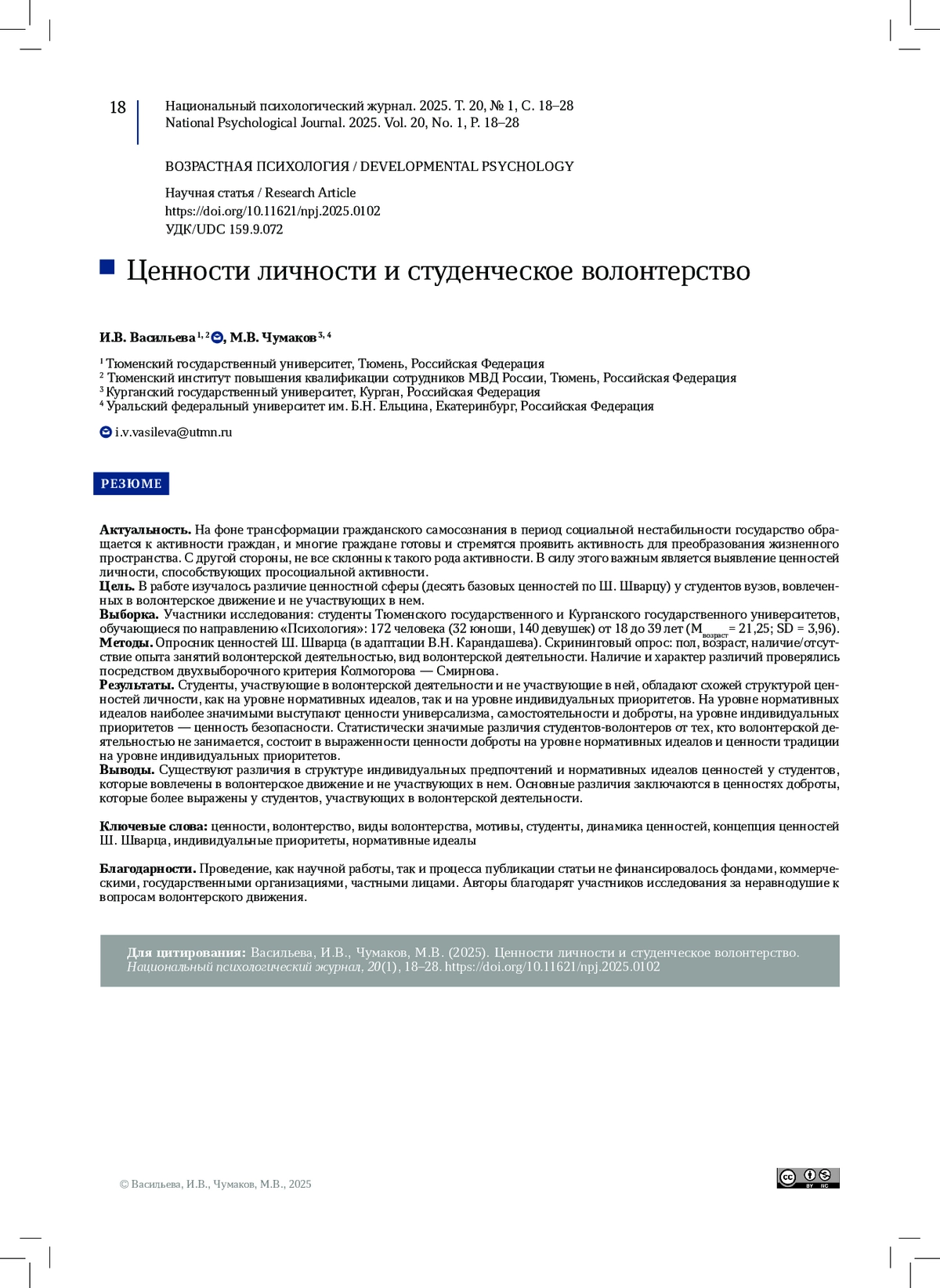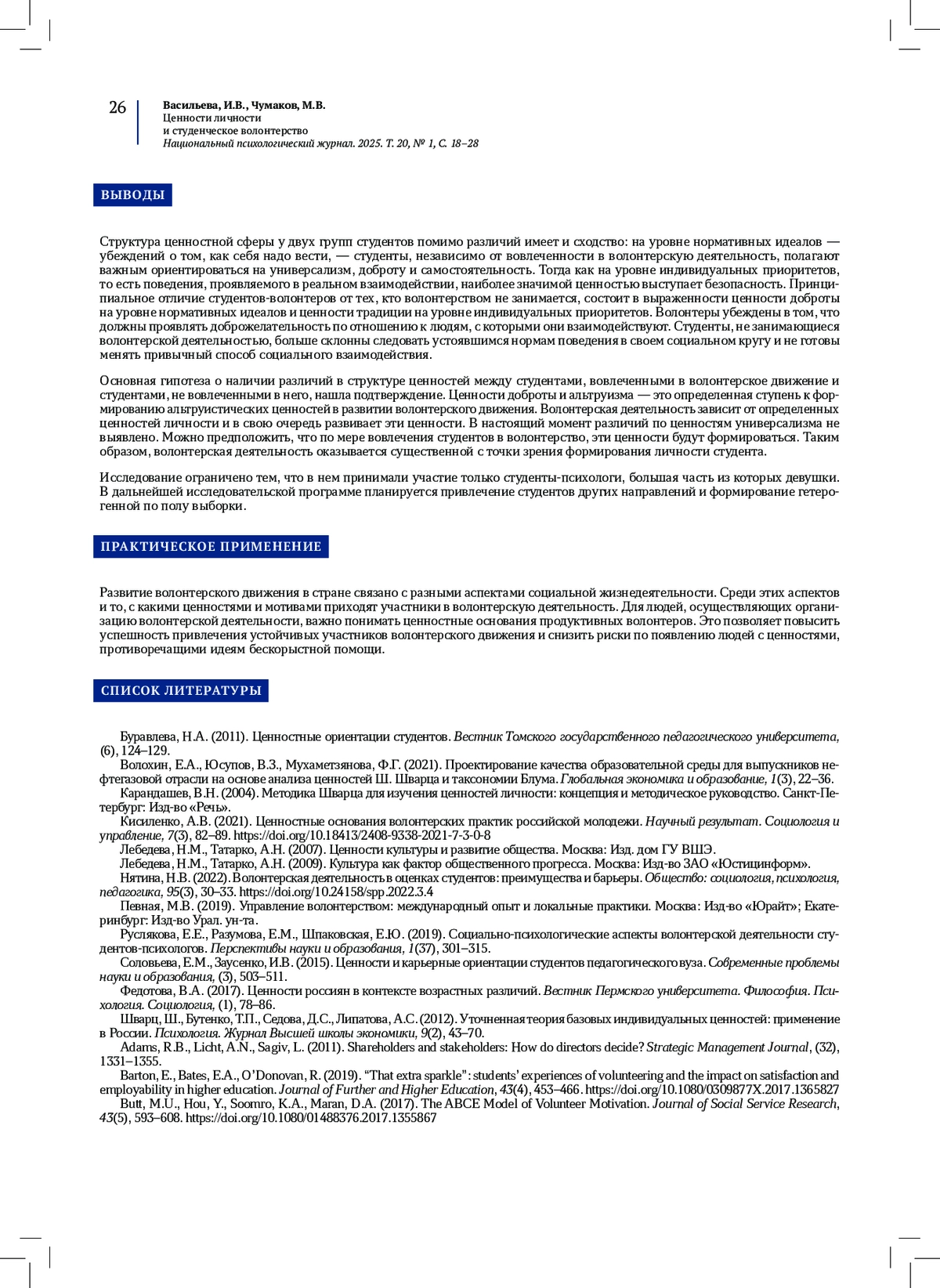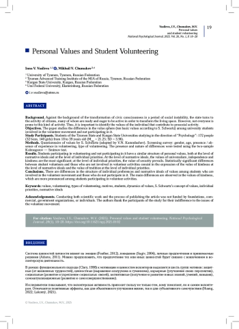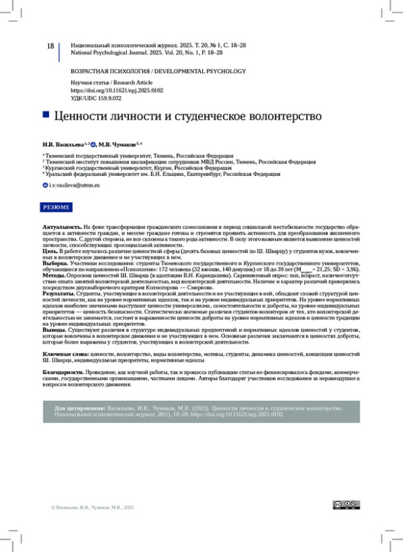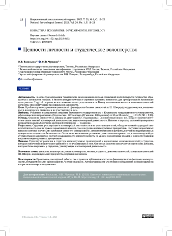 ВАСИЛЬЕВА И. В., ЧУМАКОВ М. В. ЦЕННОСТИ ЛИЧНОСТИ И СТУДЕНЧЕСКОЕ ВОЛОНТЕРСТВО // НАЦИОНАЛЬНЫЙ ПСИХОЛОГИЧЕСКИЙ ЖУРНАЛ. 2025. № 1, ТОМ 20