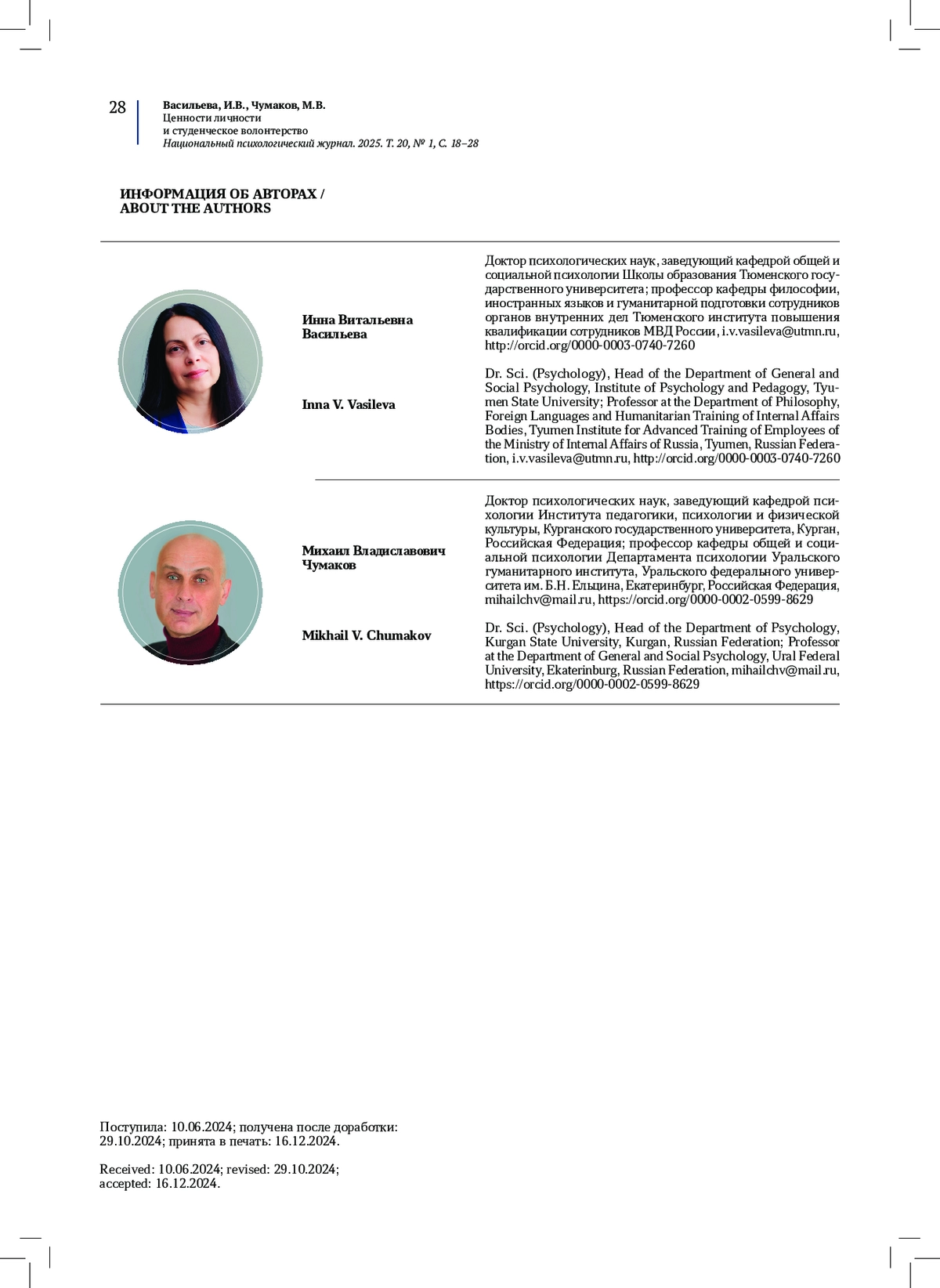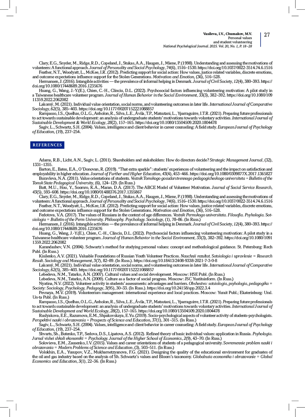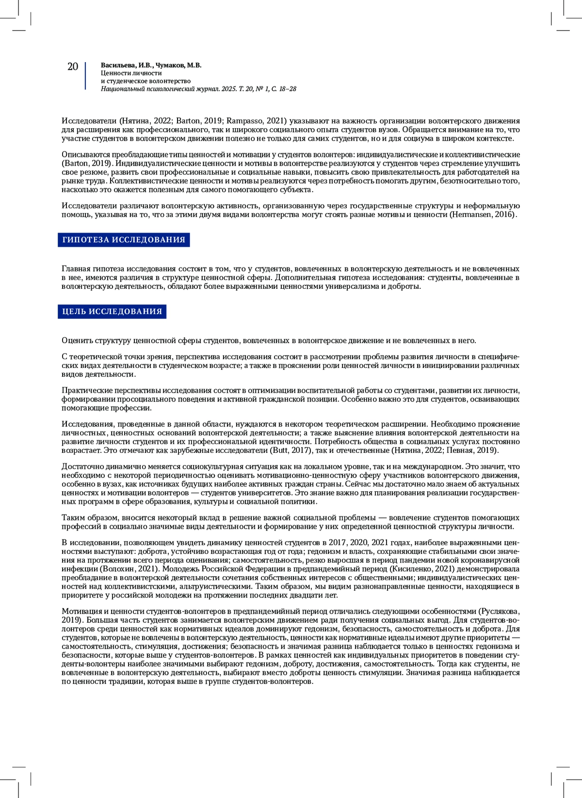 ВАСИЛЬЕВА И. В., ЧУМАКОВ М. В. ЦЕННОСТИ ЛИЧНОСТИ И СТУДЕНЧЕСКОЕ ВОЛОНТЕРСТВО // НАЦИОНАЛЬНЫЙ ПСИХОЛОГИЧЕСКИЙ ЖУРНАЛ. 2025. № 1, ТОМ 20