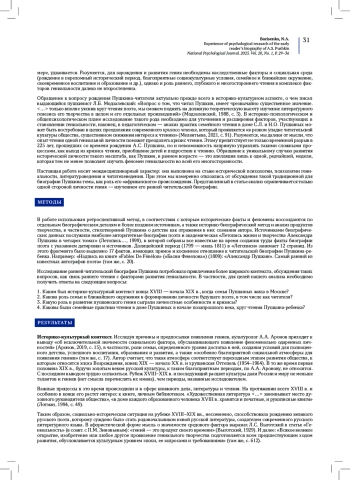 Результаты. В ранней читательской биографии Пушкина выделено три периода: 1) 1799–1803 гг. («предчтение») — младенчество и раннее детство, во время которых приобретается опыт слушания Пушкиным-ребенком малых жанров фольклора, происходит овладение речью как предпосылкой будущего навыка чтения; 2) 1804–1806 гг. — раннее обучение чтению и первый самостоятельный опыт в чтении; 3) 1807–1811 — «охота к чтению» (А. С. П ушкин), роль отцовской библиотеки в читательской биографии поэта. Выявлены основные черты читательского развития Пушкина в детстве (ускоренное развитие, двуязычие, широта читательских интересов, инициативность, одержимость чтением, связь с ранним поэтическим опытом).