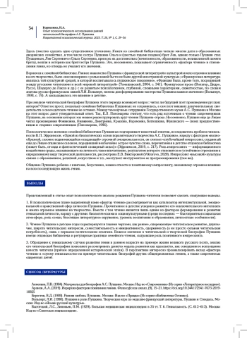 Выводы. Расширено представление о социальных факторах, влияющих на развитие и реализацию личности гения в ранние годы. К таким факторам, в частности, относится «фактор чтения», который совместно с другими (благоприятный историкокультурный контекст, роль литературно одаренной семьи С. Л. и Н. О. Пушкиных и ближайшего окружения) и при обязательном действии генетического фактора, участвует в становлении пушкинского гения.