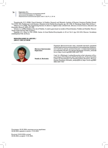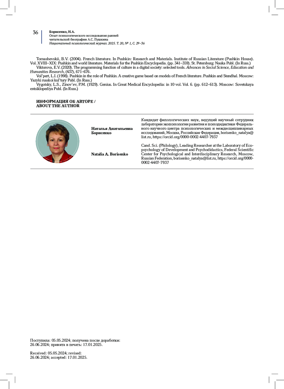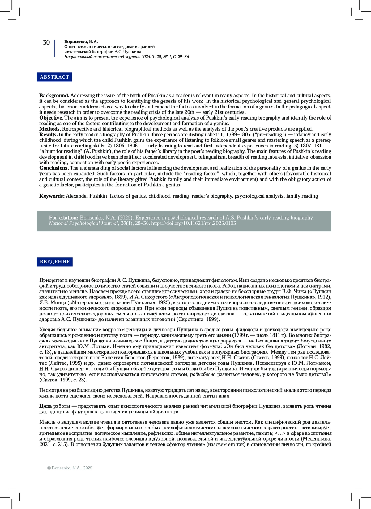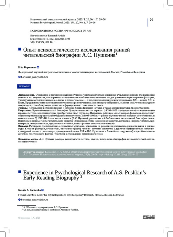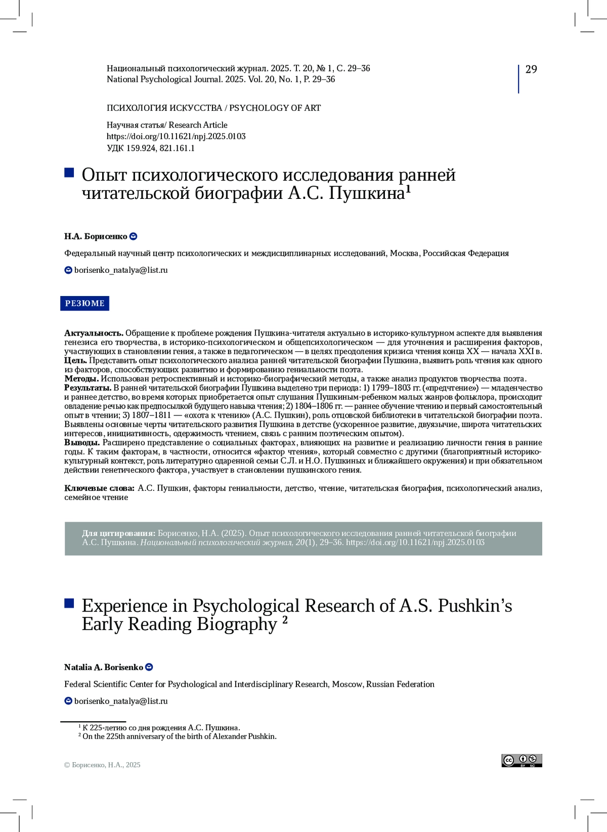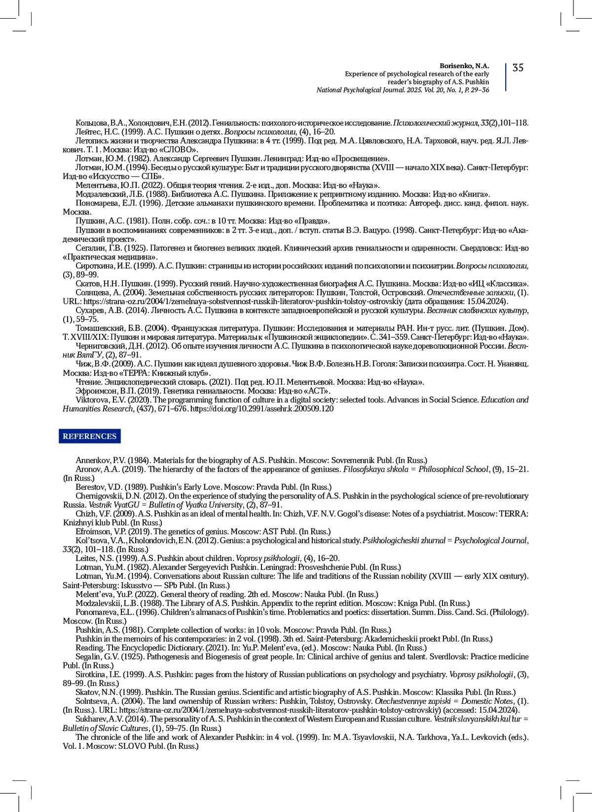 БОРИСЕНКО Н. А. ОПЫТ ПСИХОЛОГИЧЕСКОГО ИССЛЕДОВАНИЯ РАННЕЙ ЧИТАТЕЛЬСКОЙ БИОГРАФИИ А. С. П УШКИНА1 // НАЦИОНАЛЬНЫЙ ПСИХОЛОГИЧЕСКИЙ ЖУРНАЛ. 2025. № 1, ТОМ 20