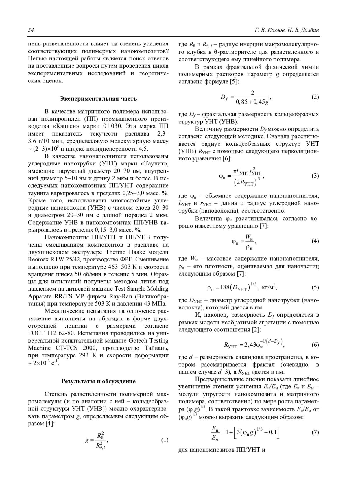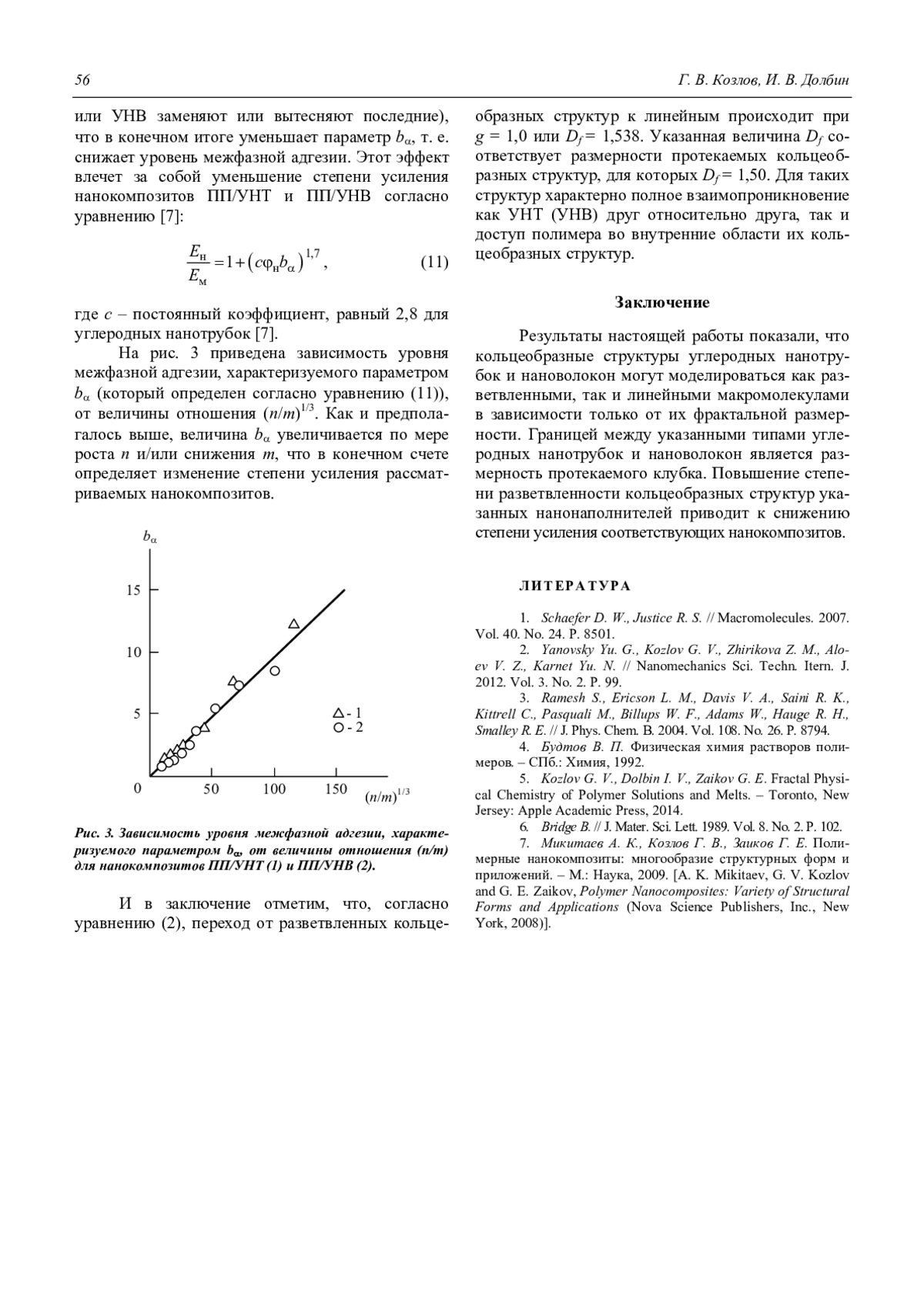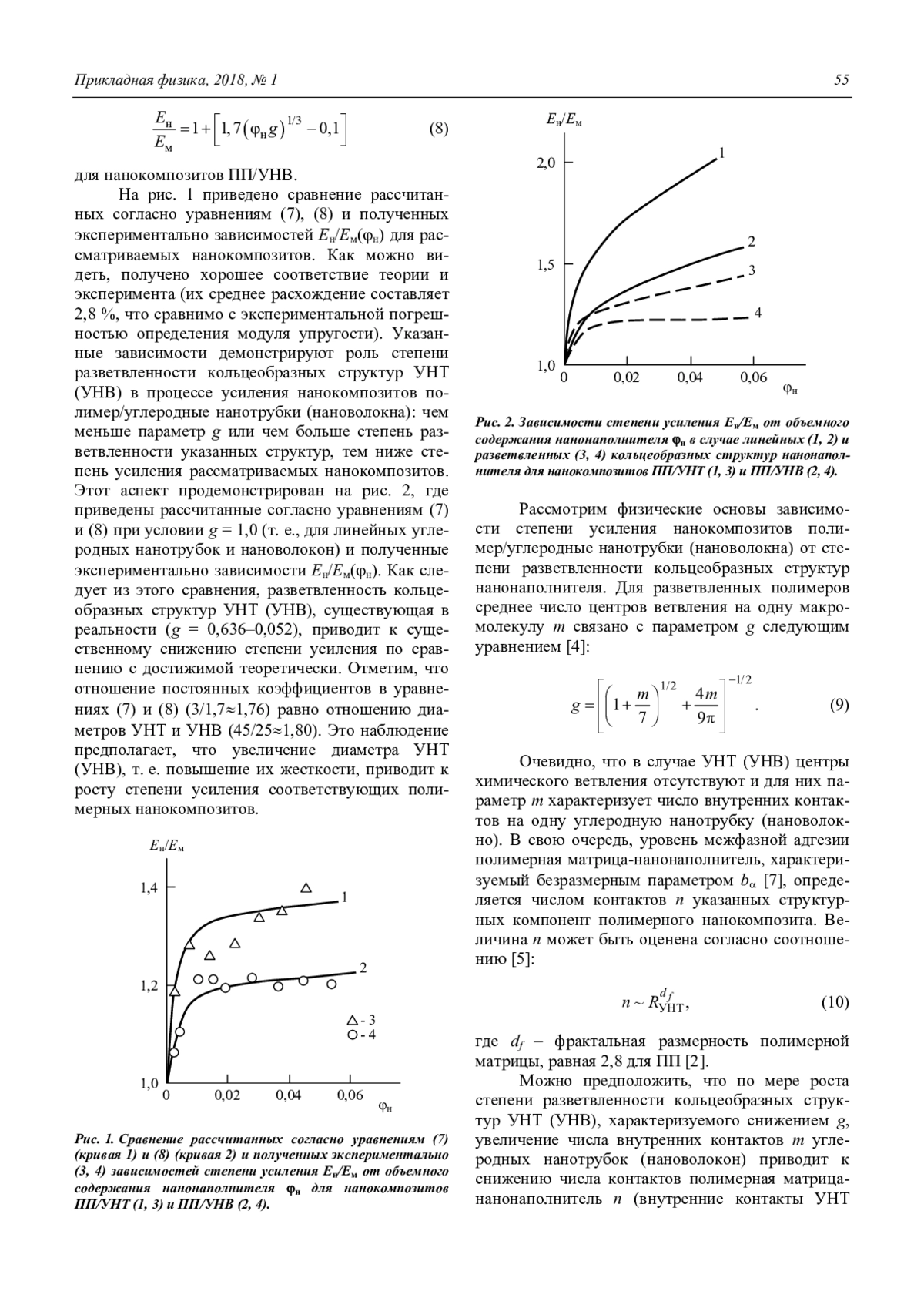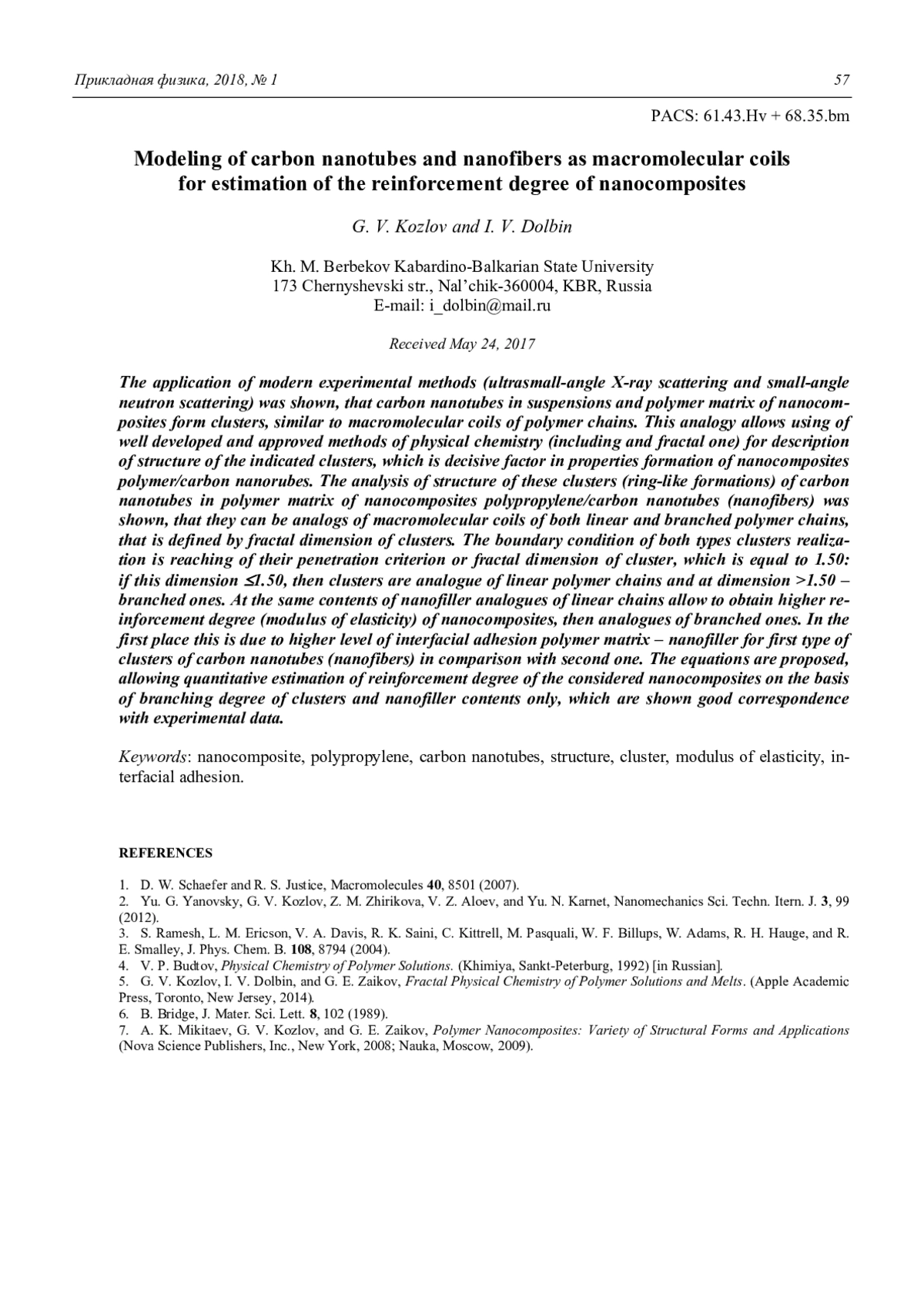 КОЗЛОВ Г. В., ДОЛБИН И. В. МОДЕЛИРОВАНИЕ УГЛЕРОДНЫХ НАНОТРУБОК И НАНОВОЛОКОН КАК МАКРОМОЛЕКУЛЯРНЫХ КЛУБКОВ ДЛЯ ОЦЕНКИ СТЕПЕНИ УПРОЧНЕНИЯ НАНОКОМПОЗИТОВ // ПРИКЛАДНАЯ ФИЗИКА. 2018. №1