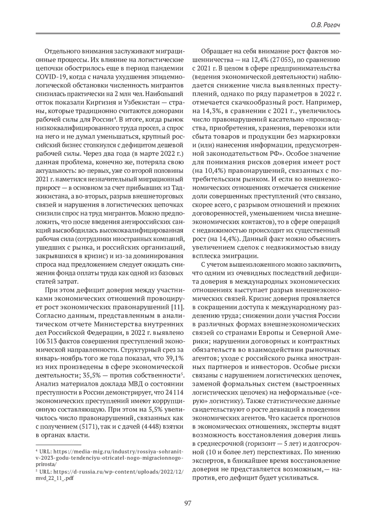 В статье с помощью экспертного опроса (интервью) специалистов, изучения статистической отчетности и метода прогнозирования проведен анализ рисков и оценены последствия дефицита доверия в экономических отношениях. В результате автор делает вывод о том, что дефицит доверия инициирует развитие девиантных моделей экономического поведения. Разрыв социальных связей, кризис институциональных условий, размывание значимости репутационного капитала снижают готовность экономических агентов соблюдать гарантии добросовестного выполнения обязательств. В сложившихся условиях стабилизации экономических отношений можно достичь, наращивая генерализированное доверие в обществе и создавая институциональные условия для формирования предсказуемости действий экономических субъектов. Для компенсации рисков доверия на международной арене следует развивать новые каналы ведения внешнеэкономической деятельности и выстраивать обновленные логистические цепочки.