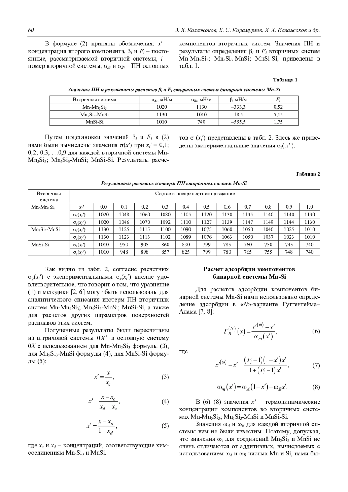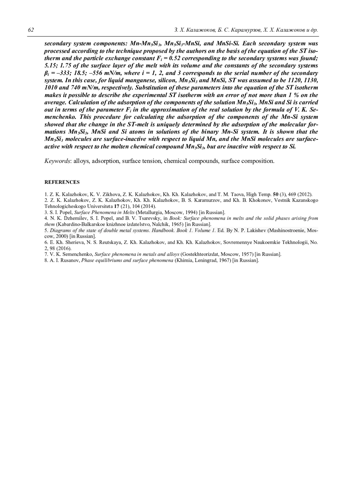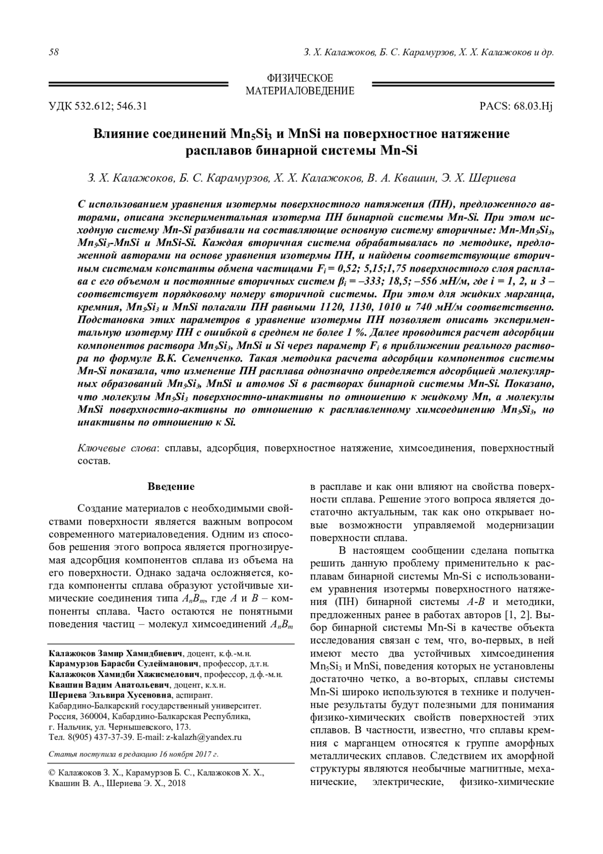 КАЛАЖОКОВ З. Х., КАРАМУРЗОВ Б. С., КАЛАЖОКОВ Х. Х., КВАШИН В. А., ШЕРИЕВА Э. Х. ВЛИЯНИЕ СОЕДИНЕНИЙ MN5SI3 И MNSI НА ПОВЕРХНОСТНОЕ НАТЯЖЕНИЕ РАСПЛАВОВ БИНАРНОЙ СИСТЕМЫ MN-SI // ПРИКЛАДНАЯ ФИЗИКА. 2018. №1