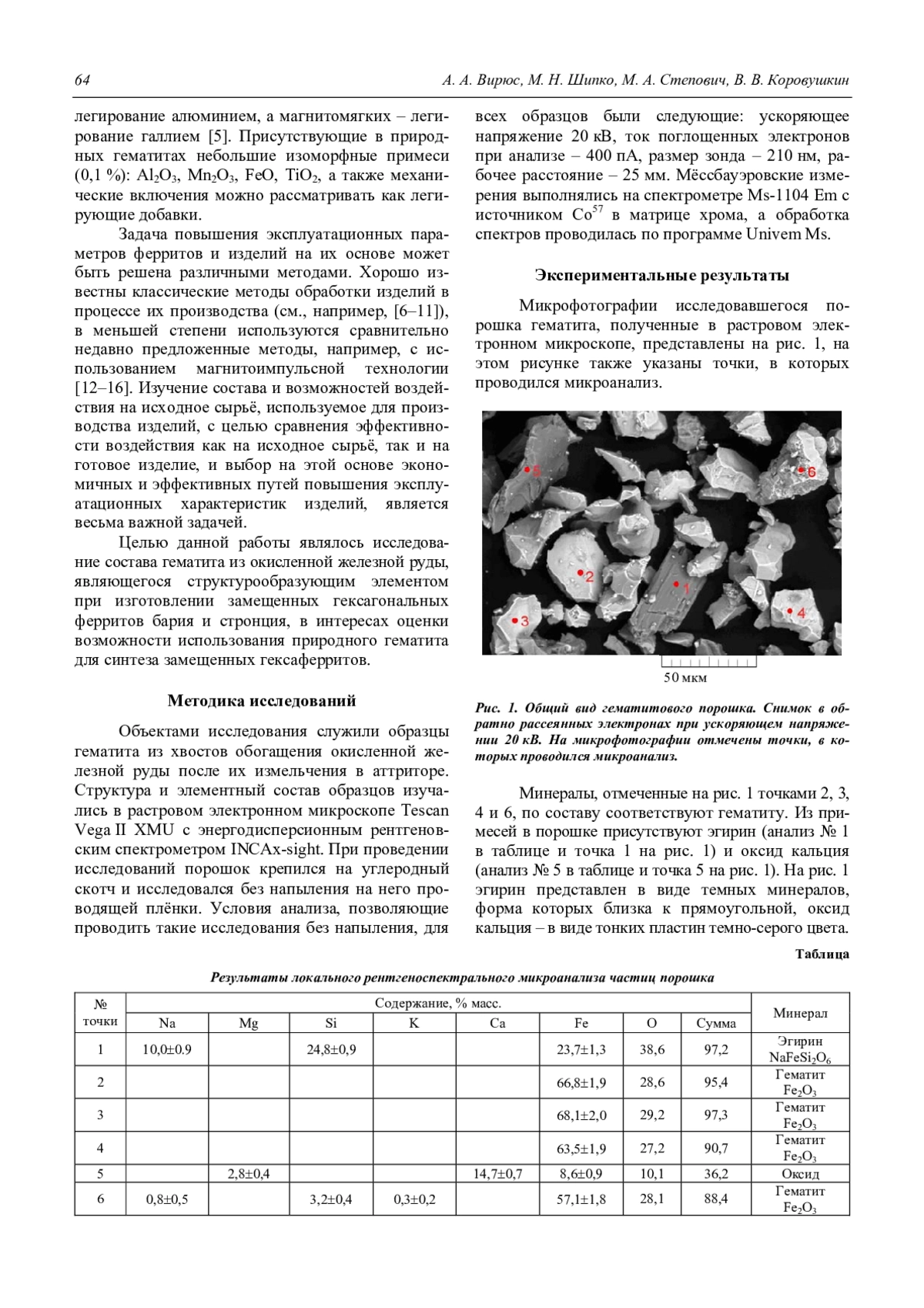 Вирюс А. А., Шипко М. Н., Степович М. А., Коровушкин В. В. Комплексный микроанализ состава и структуры порошков гематита 63