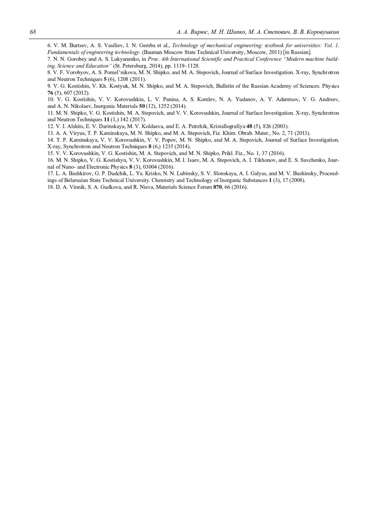 16. Shipko M. N., Kostishyn V. G., Korovushkin V. V., Isaev I. M., Stepovich M. A., Tikhonov A. I., Savchenko E. S. // Journal of Nano- and Electronic Physics. 2016. Vol. 8. No. 3. P. 03004.
