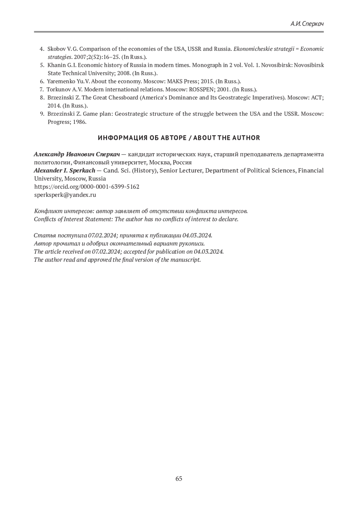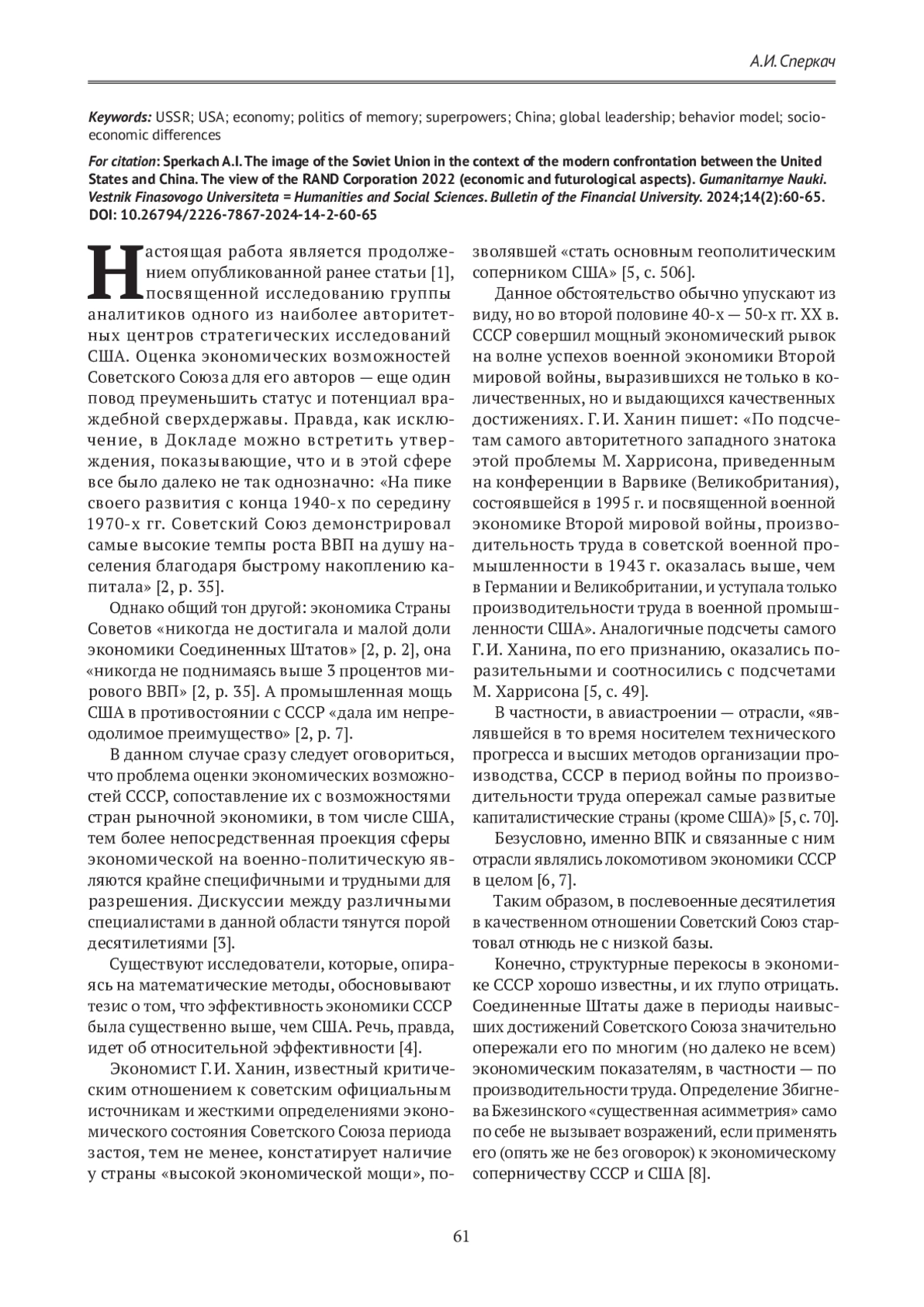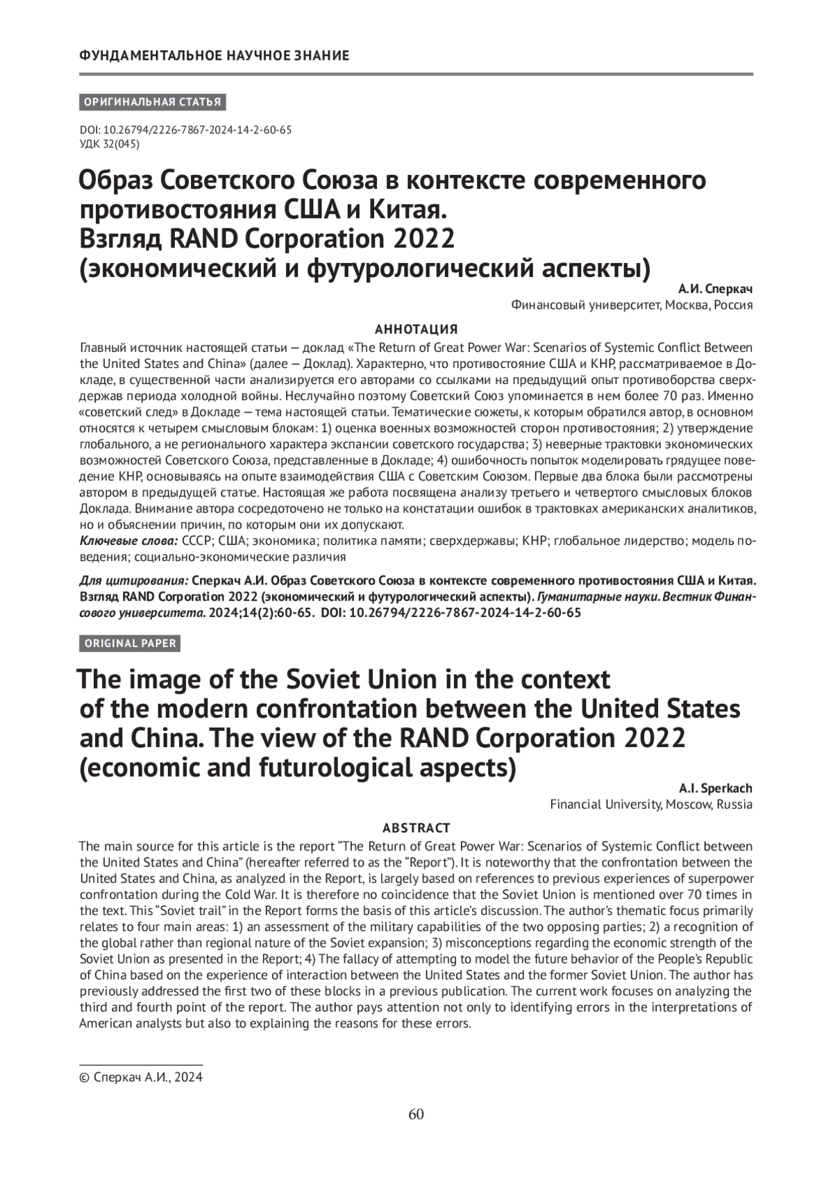 СПЕРКАЧ А. И. ОБРАЗ СОВЕТСКОГО СОЮЗА В КОНТЕКСТЕ СОВРЕМЕННОГО ПРОТИВОСТОЯНИЯ США И КИТАЯ. ВЗГЛЯД RAND CORPORATION 2022 (ЭКОНОМИЧЕСКИЙ И ФУТУРОЛОГИЧЕСКИЙ АСПЕКТЫ) // ГУМАНИТАРНЫЕ НАУКИ. ВЕСТНИК ФИНАНСОВОГО УНИВЕРСИТЕТА. 2024. ТОМ 14, № 2
