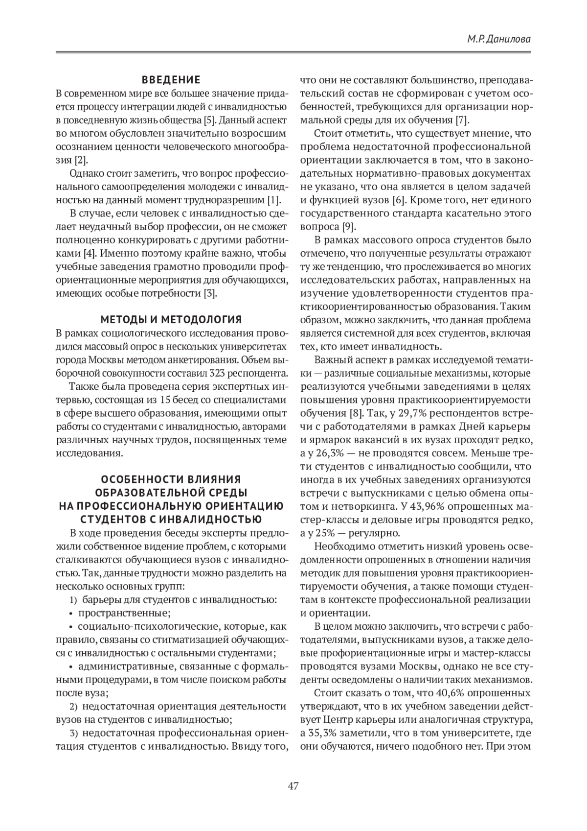 4. Ихнева В. Е. Профессиональное консультирование как этап профессиональной ориентации студентов с инвалидностью. Гуманитарные, социально-экономические и общественные науки. 2023;(1):34-37.