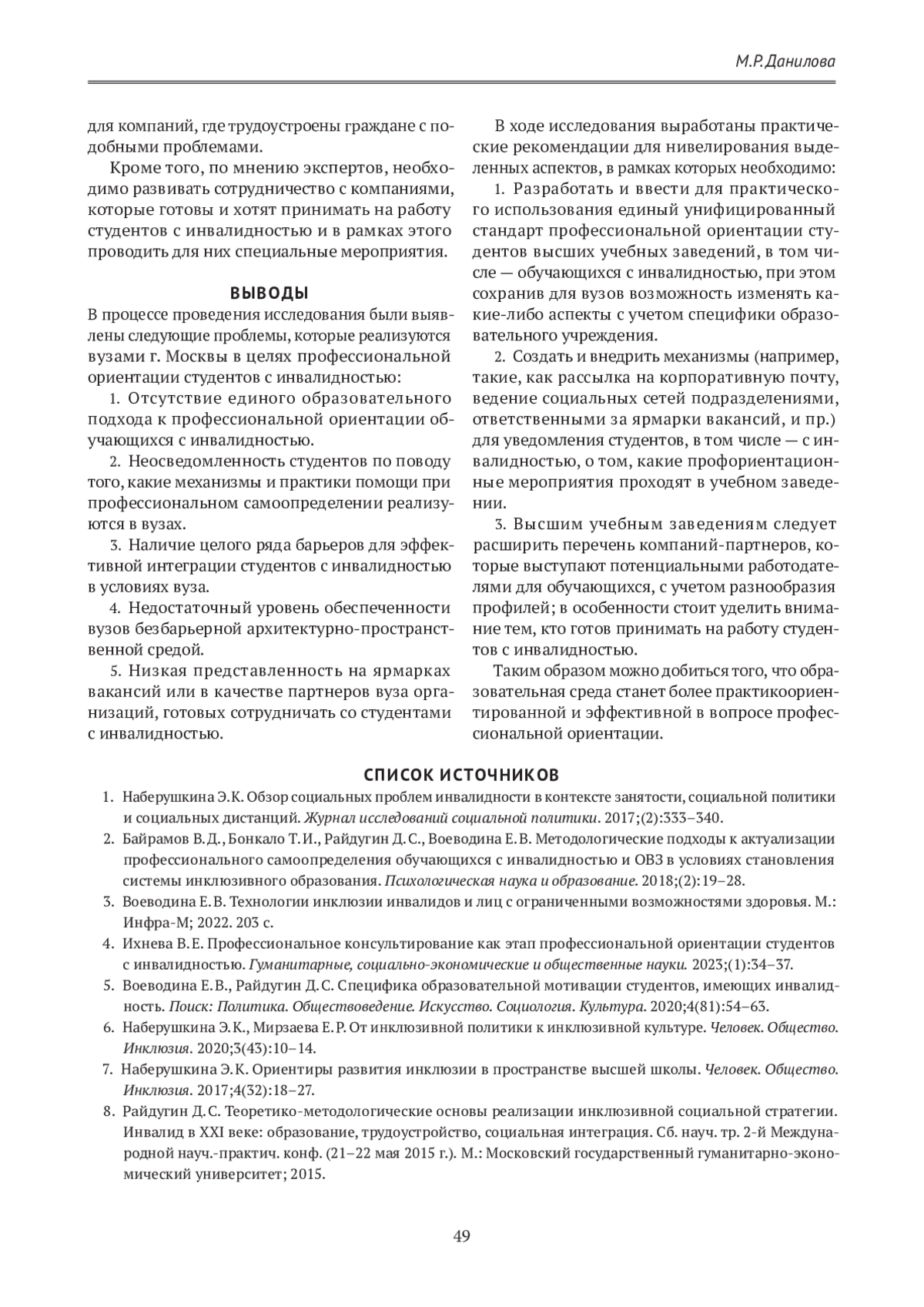 2. Байрамов В. Д., Бонкало Т. И., Райдугин Д. С., Воеводина Е. В. Методологические подходы к актуализации профессионального самоопределения обучающихся с инвалидностью и ОВЗ в условиях становления системы инклюзивного образования. Психологическая наука и образование. 2018;(2):19-28.