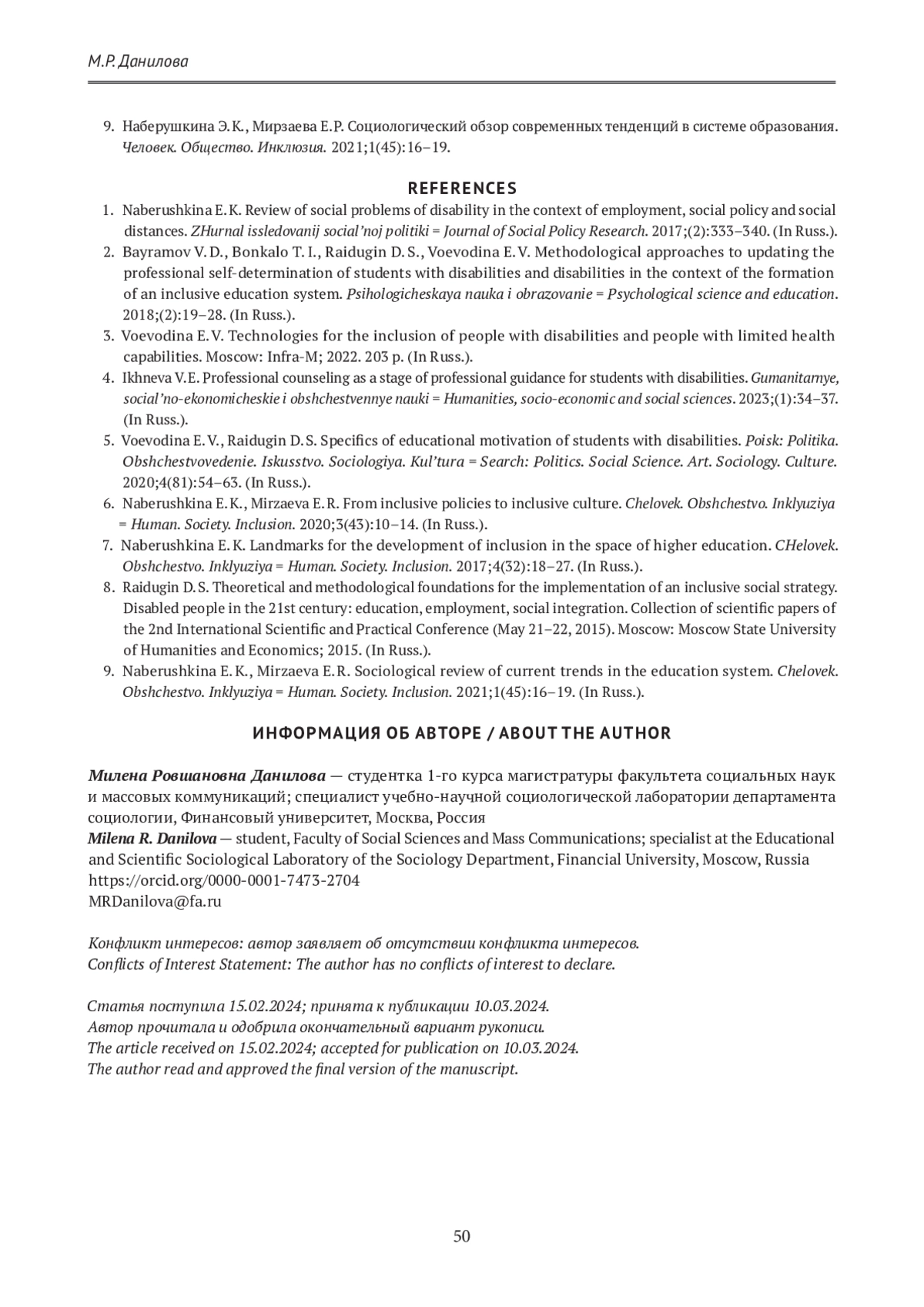 6. Наберушкина Э. К., Мирзаева Е. Р. От инклюзивной политики к инклюзивной культуре. Человек. Общество. Инклюзия. 2020;3(43):10-14.