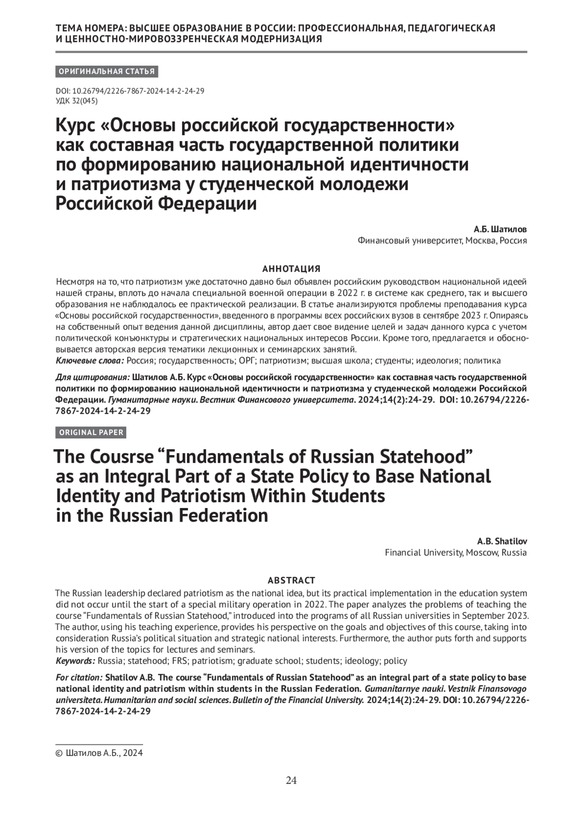 ШАТИЛОВ А. Б. КУРС «ОСНОВЫ РОССИЙСКОЙ ГОСУДАРСТВЕННОСТИ» КАК СОСТАВНАЯ ЧАСТЬ ГОСУДАРСТВЕННОЙ ПОЛИТИКИ ПО ФОРМИРОВАНИЮ НАЦИОНАЛЬНОЙ ИДЕНТИЧНОСТИ И ПАТРИОТИЗМА У СТУДЕНЧЕСКОЙ МОЛОДЕЖИ РОССИЙСКОЙ ФЕДЕРАЦИИ // ГУМАНИТАРНЫЕ НАУКИ. ВЕСТНИК ФИНАНСОВОГО УНИВЕРСИТЕТА. 2024. ТОМ 14, № 2