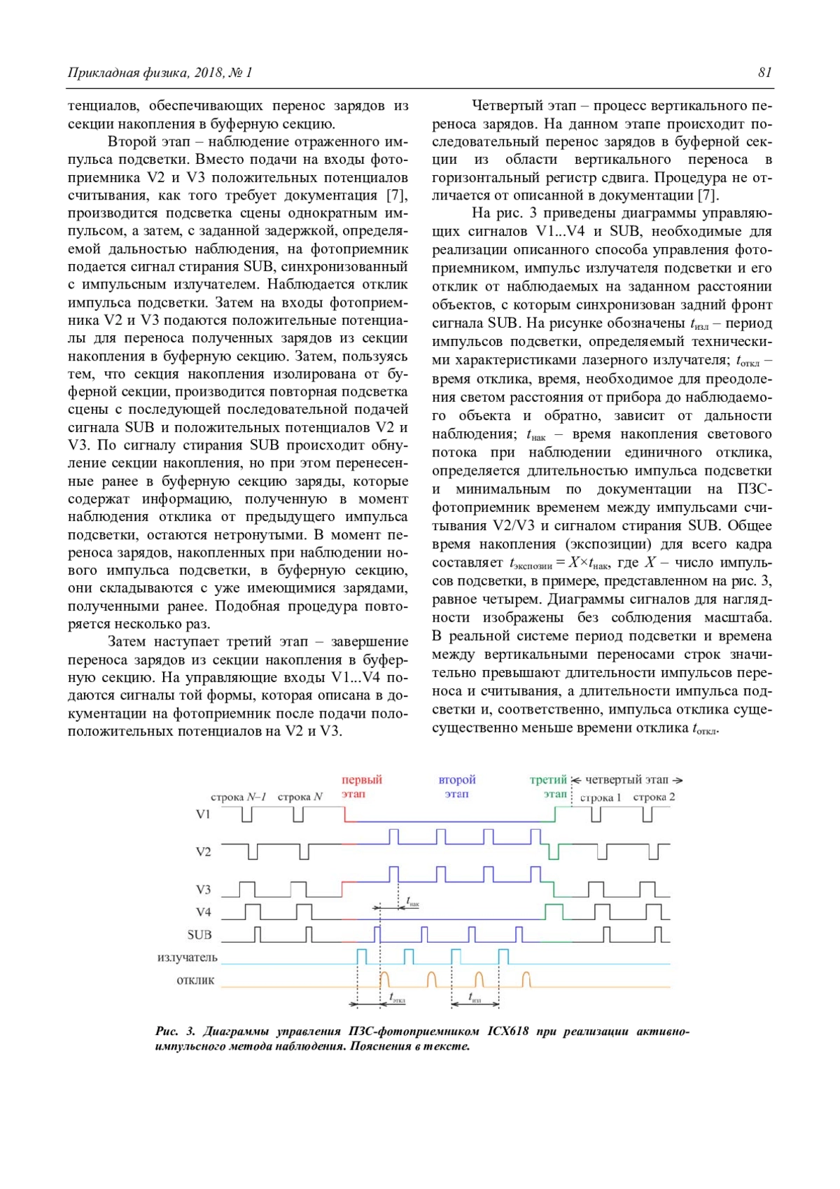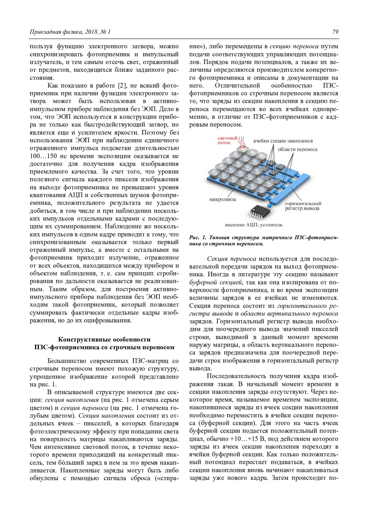 В статье описан способ управления ПЗСфотоприемниками со строчным переносом, позволяющий использовать их в составе активноимпульсных приборов наблюдения и лазерных локаторов оптических систем без использования в конструкции приборов электронно-оптических преобразователей. Приведены примеры управляющих диаграмм. Способ проверен на нескольких ПЗС-фотоприемниках различных конструкций, при этом практическая применимость предложенного способа подтверждена экспериментально.