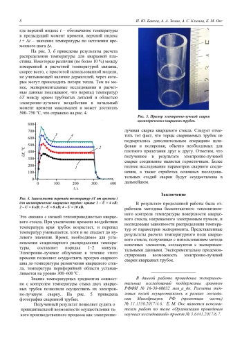В результате проделанной работы была отработана методика бесконтактного тепловизионного контроля температуры поверхности кварцевого стекла, нагреваемого электронным пучком, и исследованы зависимости распределения температур от параметров эксперимента. Представленные результаты расчета температурного поля кварцевого стекла, полученные с использованием метода конечных элементов, согласуются с экспериментальными данными. Экспериментально продемонстрирована возможность электронно-лучевой сварки кварцевых трубок.