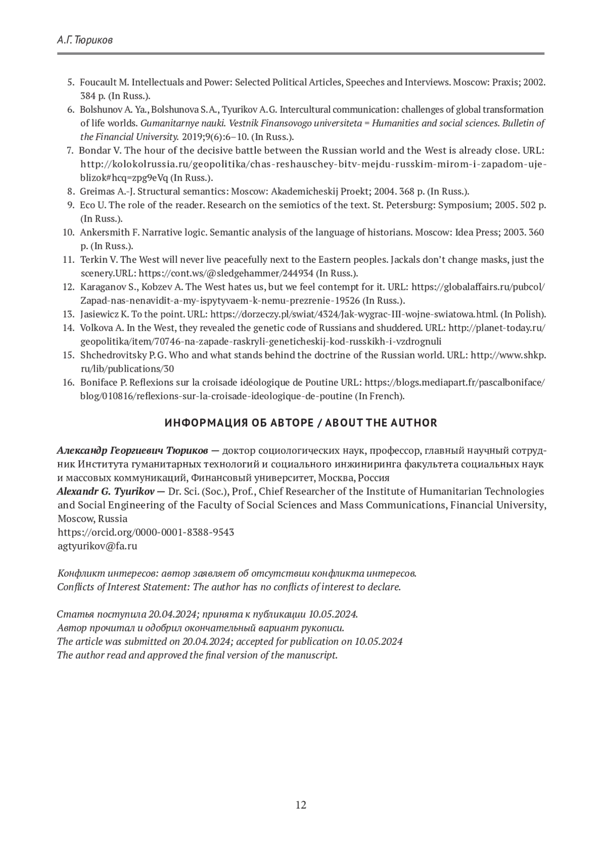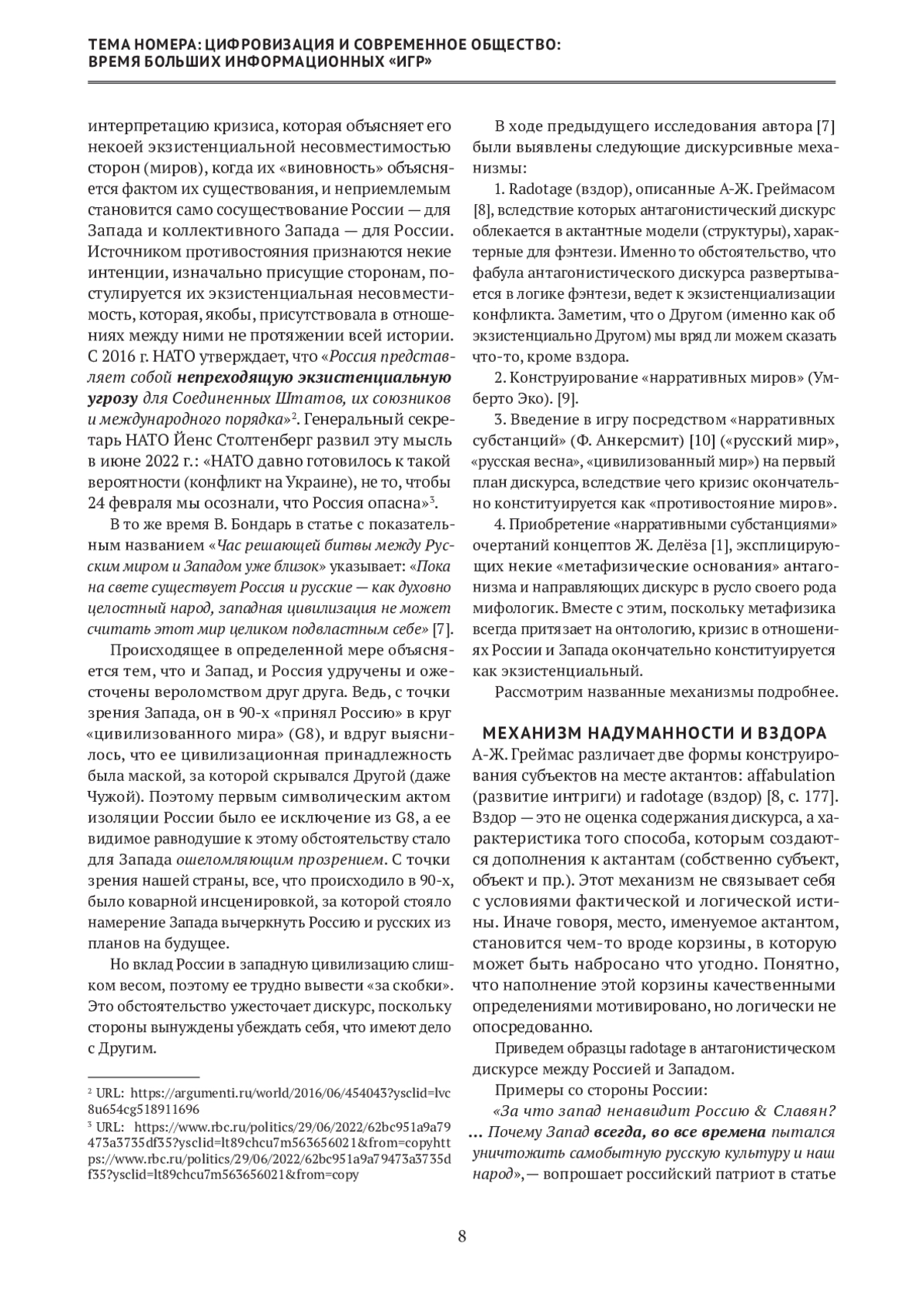 В статье на основе дискурсивного анализа описываются механизмы формирования образа «экзистенционального Другого» при наличии кризиса доверия между Россией и Западом. Анализируются зарубежные, восточные и отечественные подходы к экзистенциализации кризиса в отношениях между РФ и западными странами. В рамках этого выделены и описаны ключевые дискурсивные механизмы: надуманности, конструирования нарративных миров, введения в политическую, социокультурную и экономическую повестку «темных интенсиональных контекстов», а также механизм, направляющий дискурс в русло мифологик. Предложенный подход может быть использован в исследованиях экзистенциализации современного мирового кризиса.