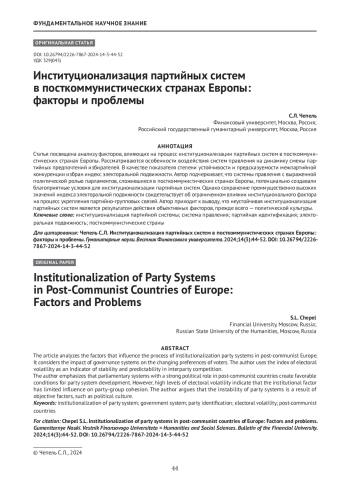 ЧЕПЕЛЬ С. Л. ИНСТИТУЦИОНАЛИЗАЦИЯ ПАРТИЙНЫХ СИСТЕМ В ПОСТКОММУНИСТИЧЕСКИХ СТРАНАХ ЕВРОПЫ: ФАКТОРЫ И ПРОБЛЕМЫ // ГУМАНИТАРНЫЕ НАУКИ. ВЕСТНИК ФИНАНСОВОГО УНИВЕРСИТЕТА. 2024. ТОМ 14, № 3