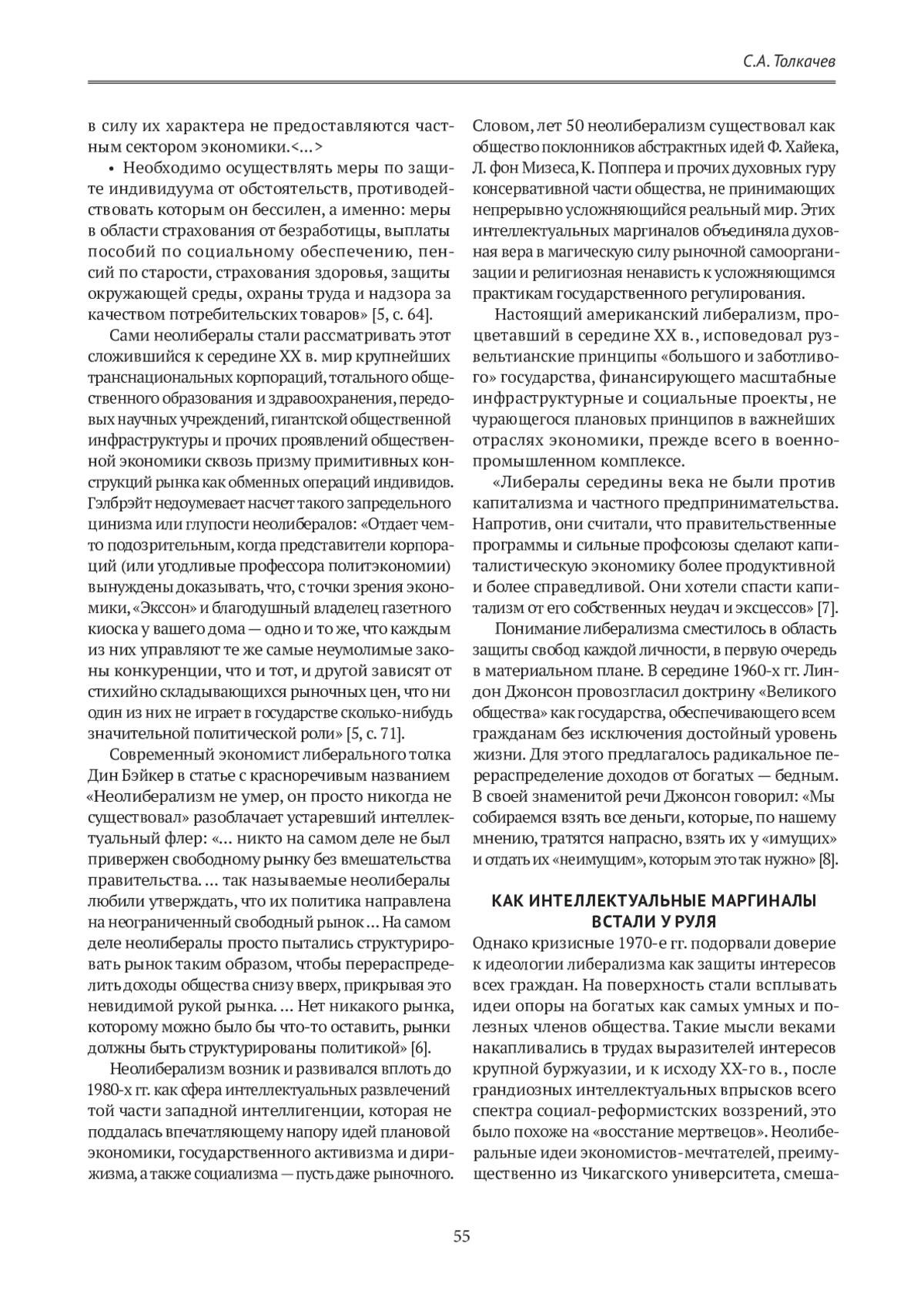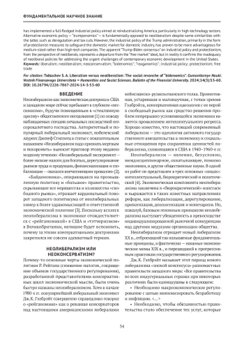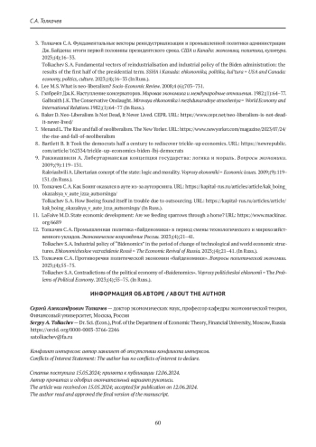 В статье рассматриваются условия и причины расцвета и упадка неолиберальной экономической идеологии в США. Актуальность исследования обусловлена концептуальными проблемами обоснования и реализации экономической политики администрации президента США Дж. Байдена на фоне сохраняющегося инерционного потенциала неолиберальной идеологии. На основе историко-логического анализа доктринальных концепций выявлено, что обозначение совокупности неоконсервативных и либертарианских идей термином «неолиберализм» является неточным и дискуссионным. Популярность неолиберализма в начале 1980-х гг. обусловлена кризисом сложившихся в середине XX в. идей и практики настоящего прогрессивного либерализма кейнсианско-рузвельтианского толка. В работе анализируются экономические мемы либерализма, где основное внимание уделено «просачиванию сверху вниз». Экономическая политика Дж. Байдена — « байденомика» — о характеризована как настоящий возврат к идеям и практике американского прогрессивного либерализма. Показано, что налоговая политика администрации Байдена представляет собой существенный отход от неолиберальных принципов, также как и усиление нормативного регулирования экономики, активизация контактов с профсоюзами и полномасштабная промышленная политика, направленная на реиндустриализацию Америки, особенно в части высокотехнологичных отраслей. Альтернативная экономическая политика — «трампономика» — в своей основе также противостоит неолиберализму, несмотря на такие фрагментарные совпадения с последним, как дерегулирование и снижение налогов. Однако промышленная политика Трампа, в основном в виде таможенной защиты внутреннего рынка, оказалась более выгодной средне-, а не высокотехнологичным отраслям. Парадоксальный «трампо-байденовский консенсус» по вопросам промышленной политики и протекционизма с точки зрения неолибералов есть отход от единственно правильного «свободного рынка», но фактически является подтверждением абсурдности неолиберального наследия для решения актуальных задач современного экономического развития США.