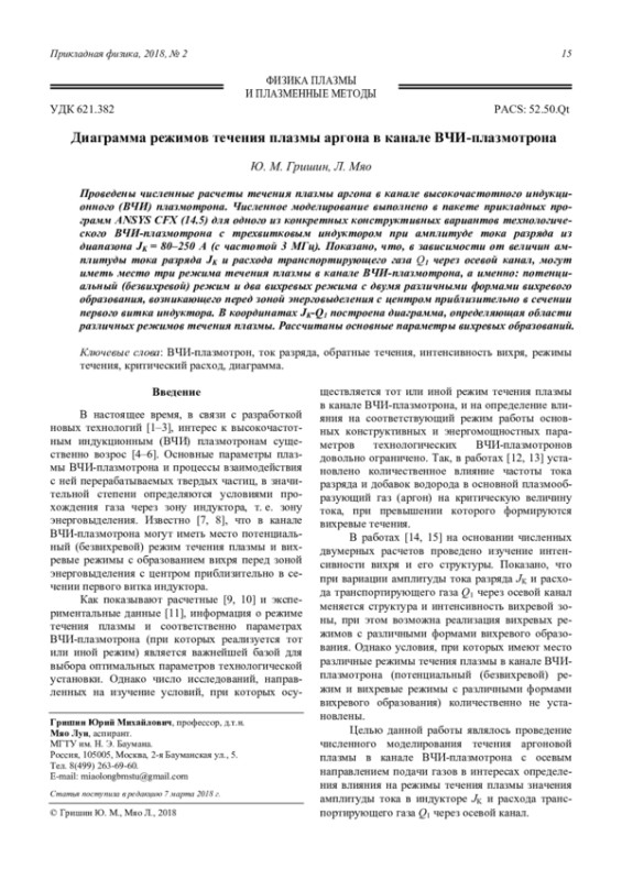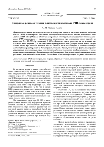 Гришин Ю. М., Мяо Л. Диаграмма режимов течения плазмы аргона в канале ВЧИ-плазмотрона 15
