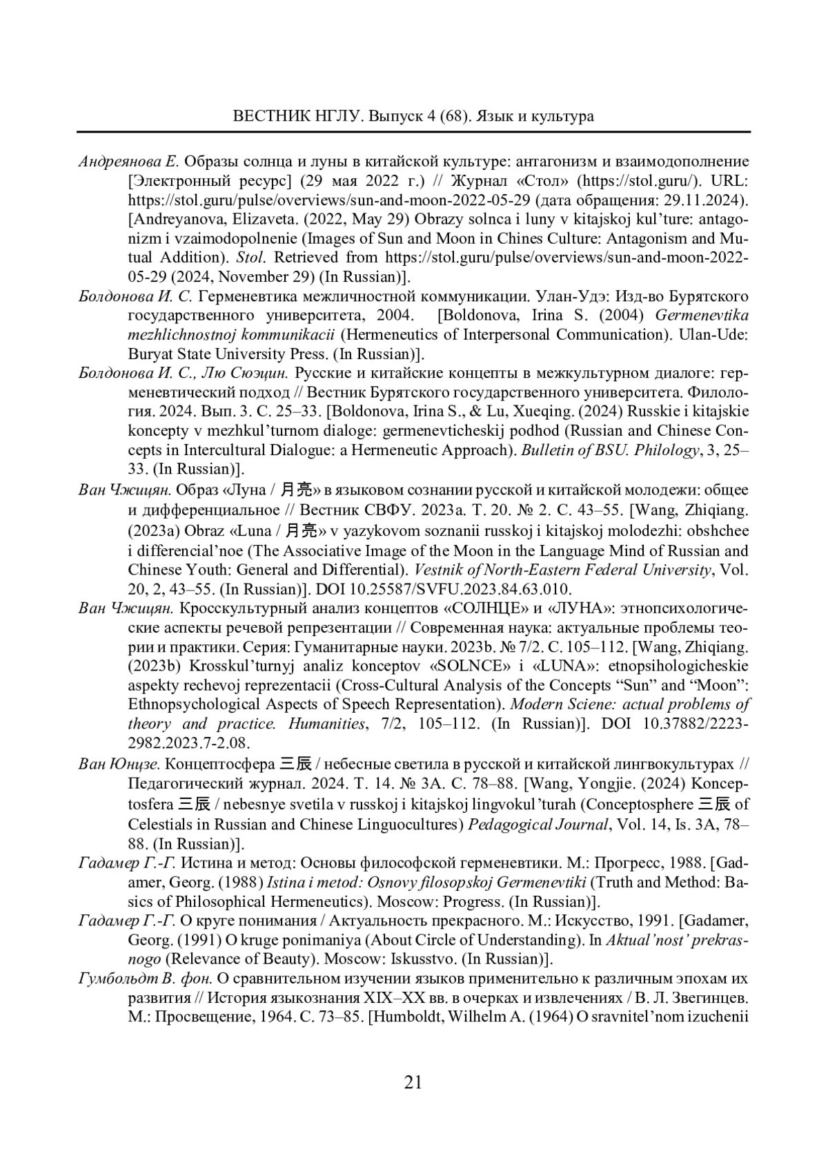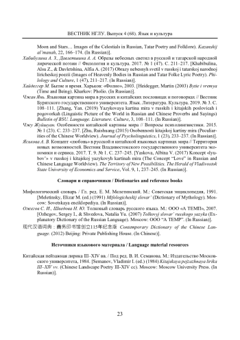 5. Ван Чжицян. Образ “Луна / 月亮” в языковом сознании русской и китайской молодежи: общее и дифференциальное // Вестник СВФУ. 2023a. Т. 20. № 2. С. 43-55. EDN: QQSSYP