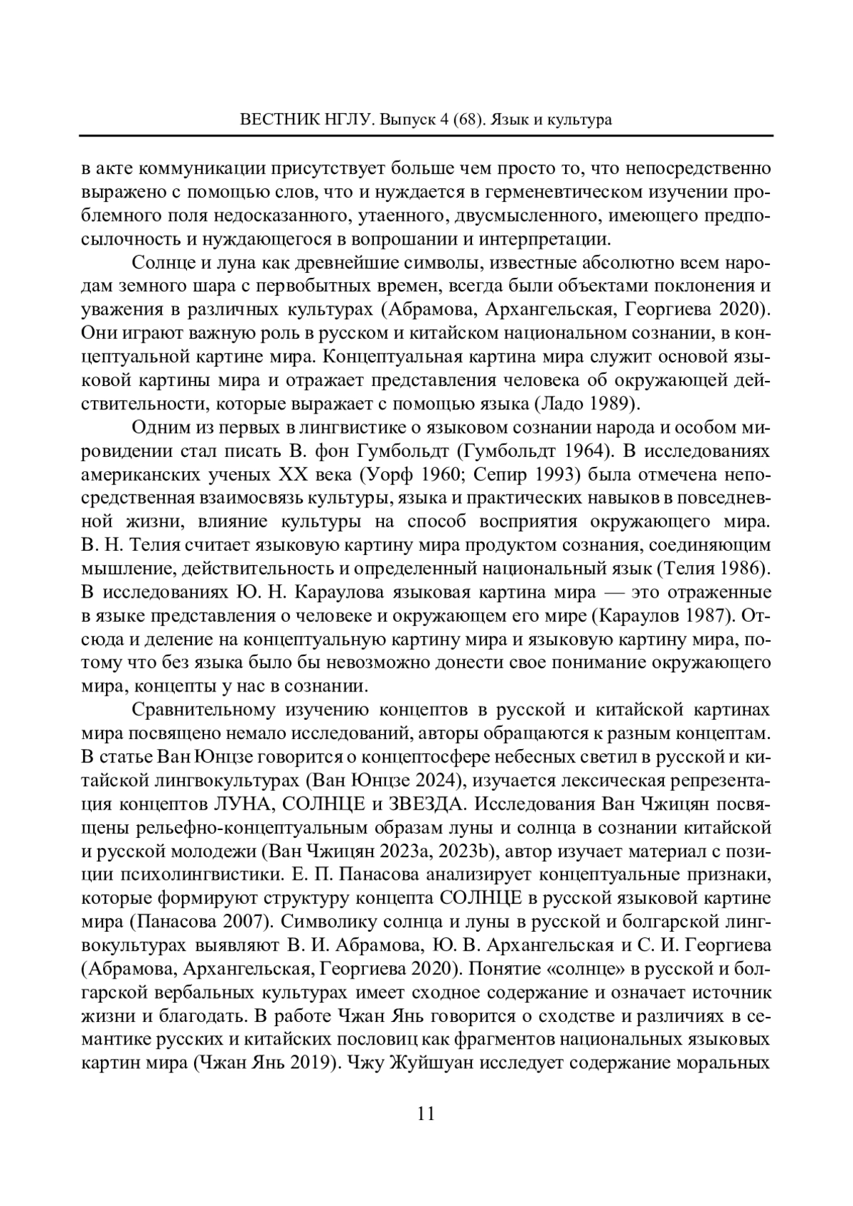 6. Ван Чжицян. Кросскультурный анализ концептов “СОЛНЦЕ” и “ЛУНА”: этнопсихологические аспекты речевой репрезентации // Современная наука: актуальные проблемы теории и практики. Серия: Гуманитарные науки. 2023b. № 7/2. С. 105-112.