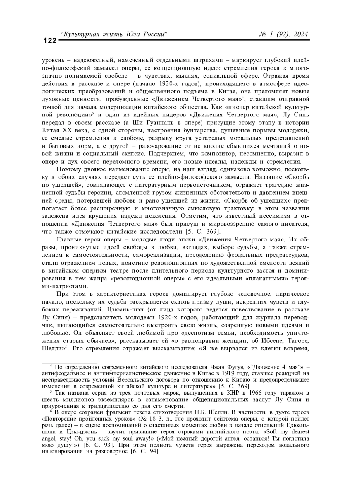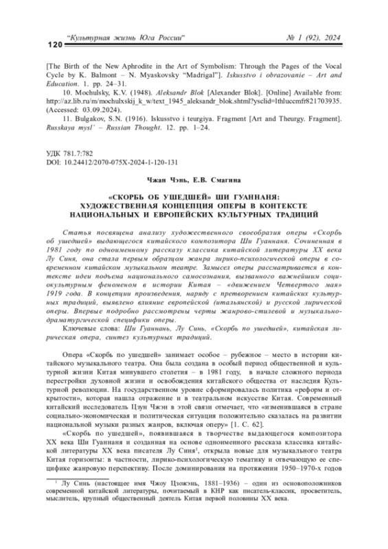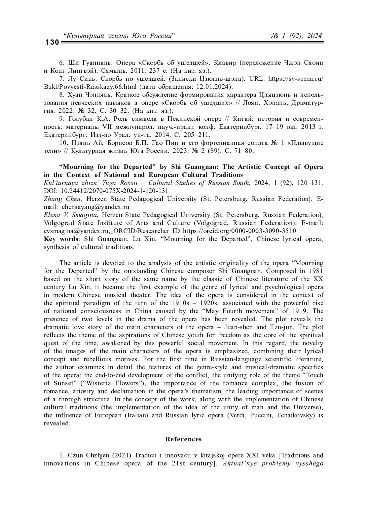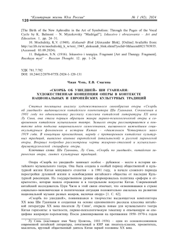 ЧЖАН Ч., СМАГИНА Е. В. "СКОРБЬ ОБ УШЕДШЕЙ" ШИ ГУАННАНЯ: ХУДОЖЕСТВЕННАЯ КОНЦЕПЦИЯ ОПЕРЫ В КОНТЕКСТЕ НАЦИОНАЛЬНЫХ И ЕВРОПЕЙСКИХ КУЛЬТУРНЫХ ТРАДИЦИЙ // КУЛЬТУРНАЯ ЖИЗНЬ ЮГА РОССИИ. 2024. № 1 (92)