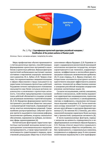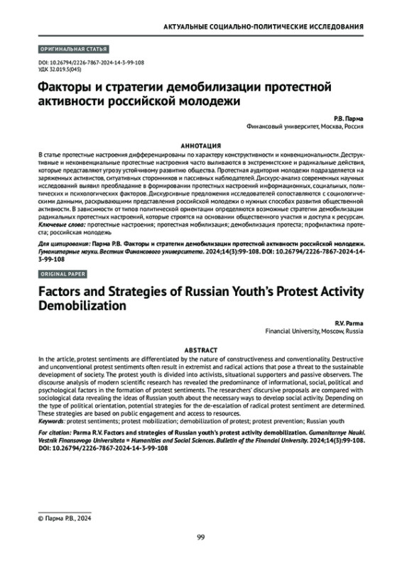 В статье протестные настроения дифференцированы по характеру конструктивности и конвенциональности. Деструктивные и неконвенциальные протестные настроения часто выливаются в экстремистские и радикальные действия, которые представляют угрозу устойчивому развитию общества. Протестная аудитория молодежи подразделяется на заряженных активистов, ситуативных сторонников и пассивных наблюдателей. Дискурс-анализ современных научных исследований выявил преобладание в формировании протестных настроений информационных, социальных, политических и психологических факторов. Дискурсивные предложения исследователей сопоставляются с социологическими данными, раскрывающими представления российской молодежи о нужных способах развития общественной активности. В зависимости от типов политической ориентации определяются возможные стратегии демобилизации радикальных протестных настроений, которые строятся на основании общественного участия и доступа к ресурсам.
