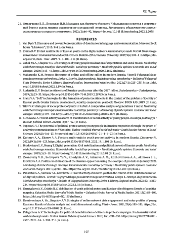 21. Омельченко Е. Л., Лисовская И. В. Молодежь как барометр будущего? Молодежная повестка в современной России сквозь мнения экспертов по молодежной политике. Мониторинг общественного мнения: экономические и социальные перемены. 2022;(2):66-92. https://doi.org/10.14515/monitoring.2022.2.2078