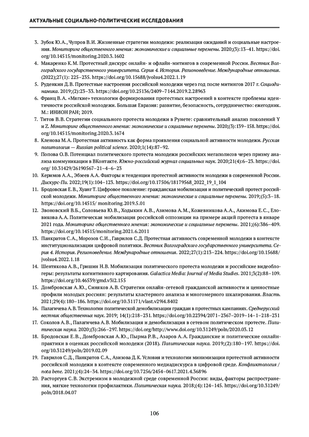 7. Титов В. В. Стратегии социального протеста молодежи в Рунете: сравнительный анализ поколений Y и Z. Мониторинг общественного мнения: экономические и социальные перемены. 2020;(3):139-158. https://doi.org/10.14515/monitoring.2020.3.1674