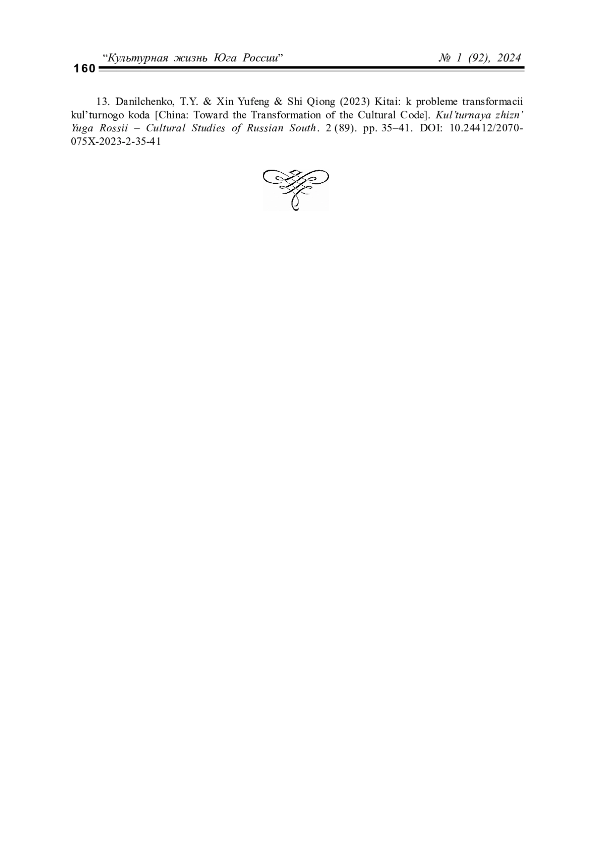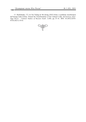 14. Данильченко Т.Ю., Синь Юйфэн, Ши Цюн. Китай: к проблеме трансформации культурного кода // Культурная жизнь Юга России. 2023. № 2 (89). С. 35-41. DOI: 10.24412/2070-075X-2023-2-35-41 EDN: PNZFWN