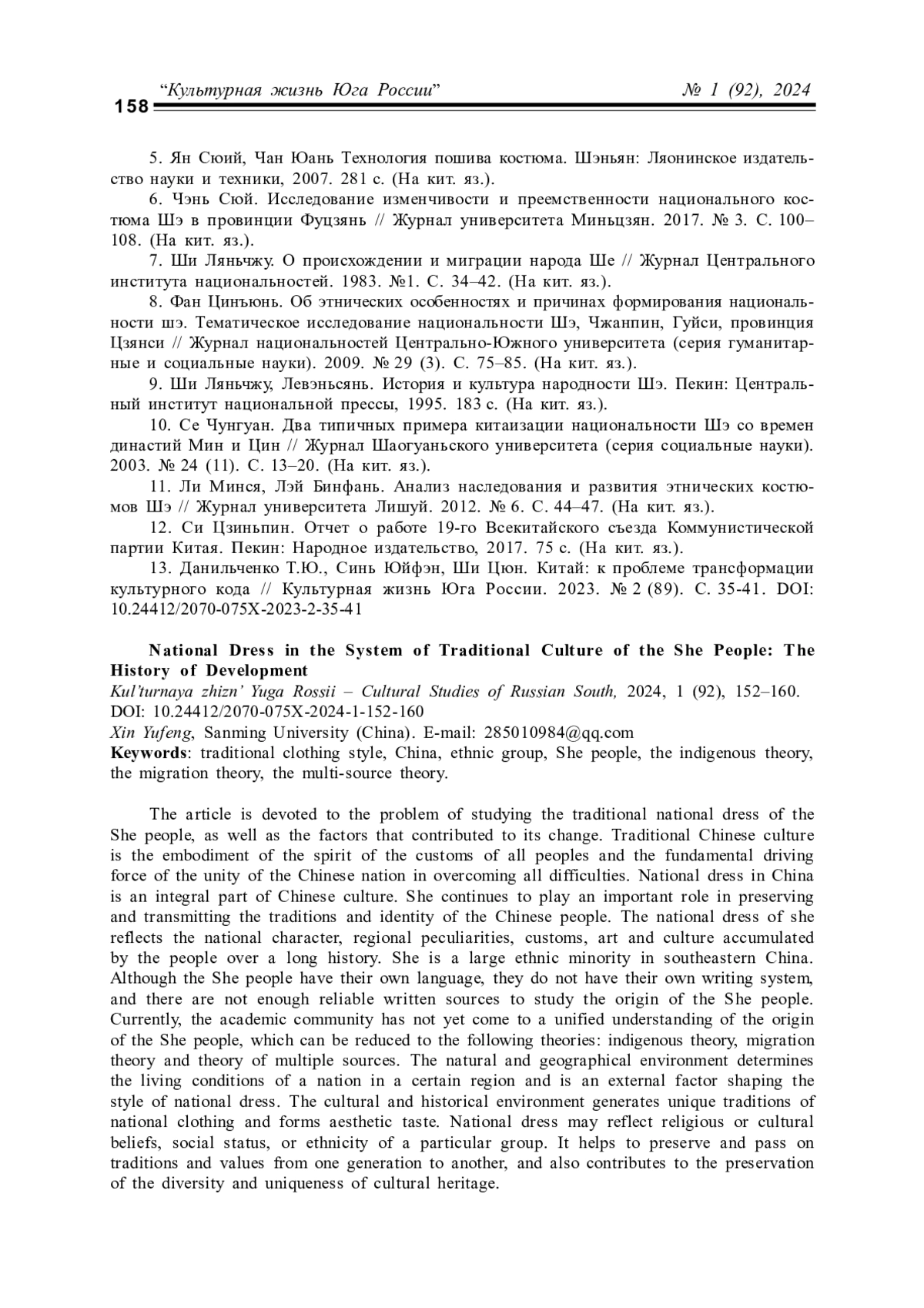 12. Ли Минся, Лэй Бинфань. Анализ наследования и развития этнических костюмов Шэ // Журнал университета Лишуй. 2012. № 6. С. 44-47. (На кит. яз.).