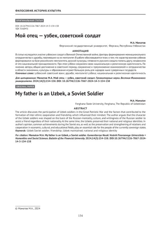 В статье исследуется участие узбекских солдат в Великой Отечественной войне, факторы формирования межнационального сотрудничества и дружбы, повлиявшие на их менталитет. В работе обосновывается тезис о том, что характер воинов-узбеков формировался на базе российского менталитета, русской культуры, готовности русского солдата помочь другу, независимо от его национальной принадлежности. При этом узбеки сохраняли свою национальную и религиозную идентичность. По мнению автора, общие достижения в советский период, сохранение и преумножение взаимосвязей и сотрудничества в области экономики, культуры и образования играют большую роль для народов ныне суверенных государств.