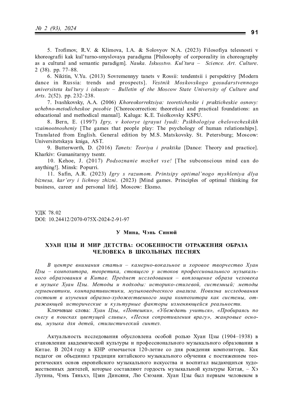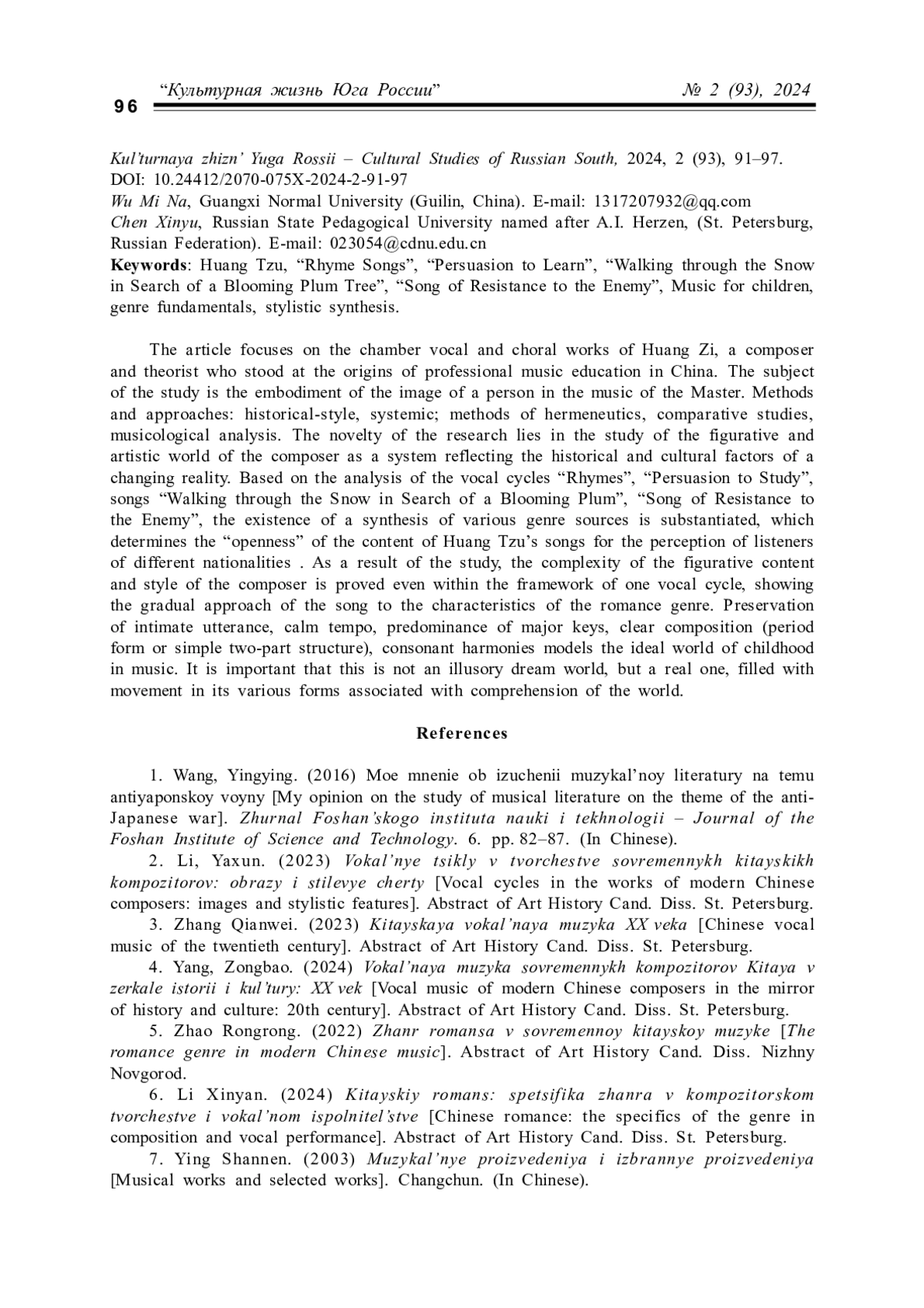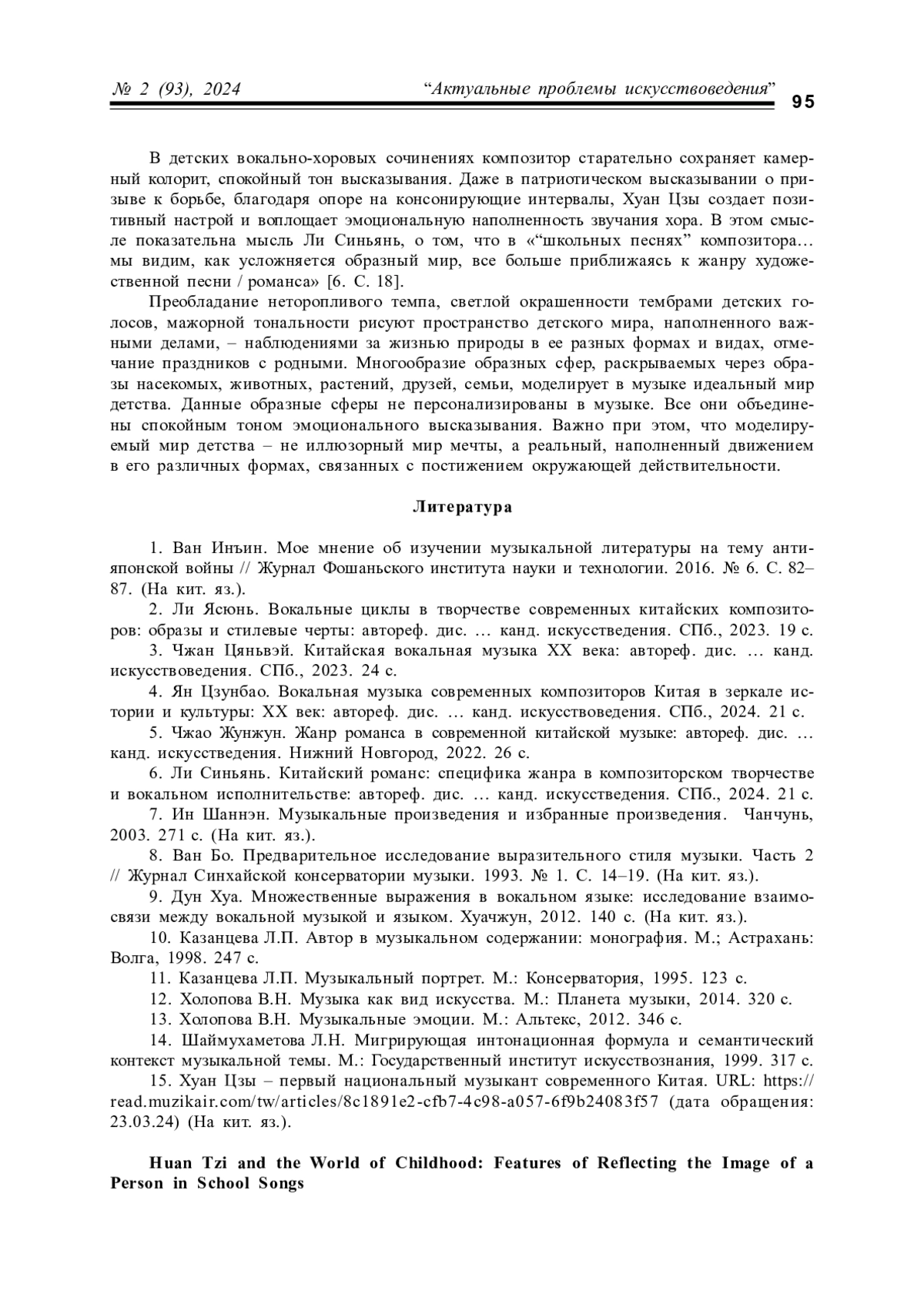 3. Чжан Цяньвэй. Китайская вокальная музыка ХХ века: автореф. дис. … канд. искусствоведения. СПб., 2023. 24 с.