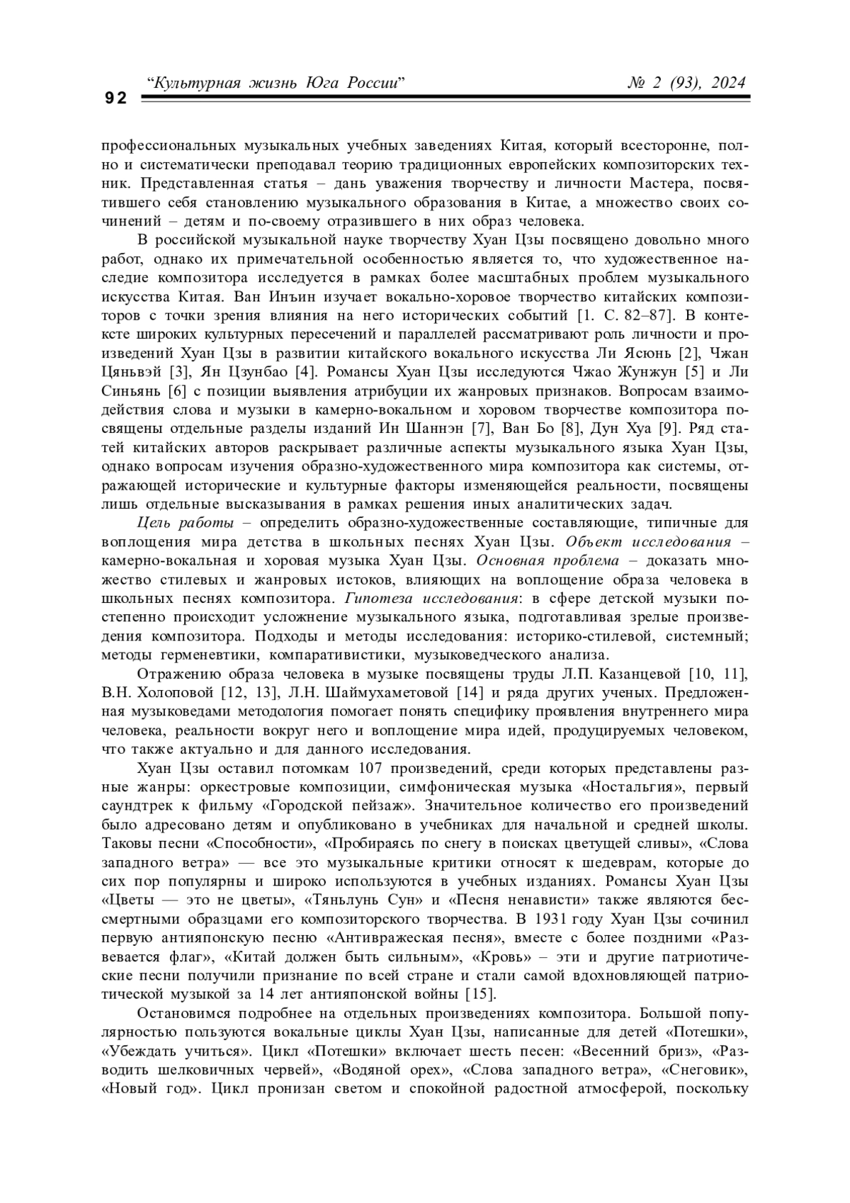 Актуальность исследования обусловлена особой ролью Хуан Цзы (1904–1938) в становлении академической культуры и профессионального музыкального образования в Китае. В 2024 году в КНР отмечается 120-летие со дня рождения композитора. Как педагог он объединил традиции китайского музыкального обучения с постижением теоретических основ европейского музыкального искусства и воспитал выдающихся художественных деятелей, которые составляют гордость музыкальной культуры Китая, – Хэ Лутина, Чэнь Тяньхэ, Цзян Динсяня, Лю Сюэаня.