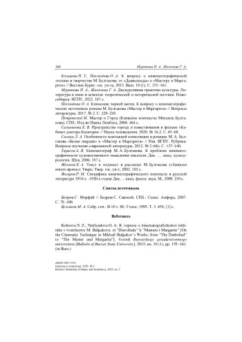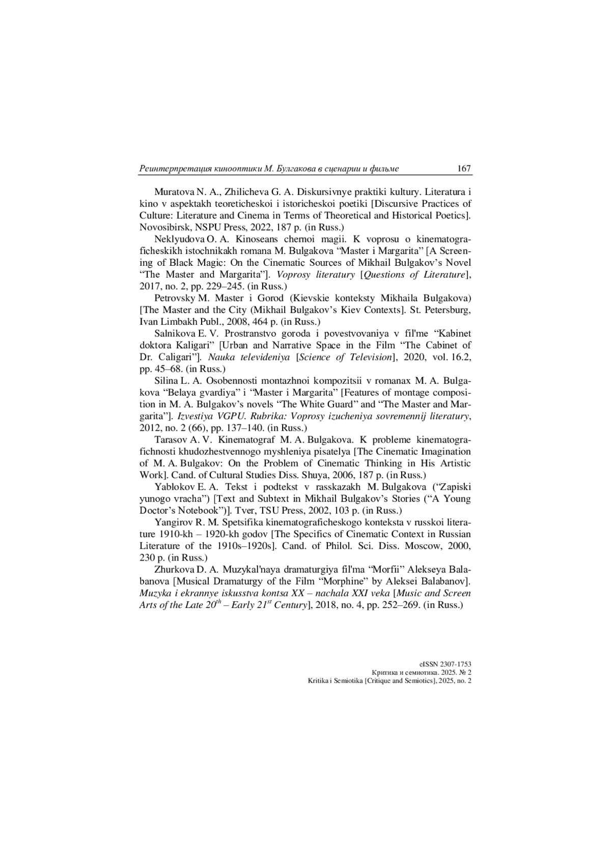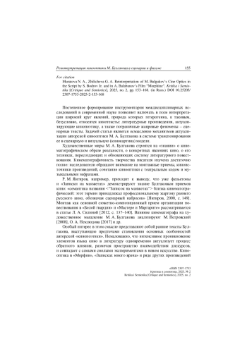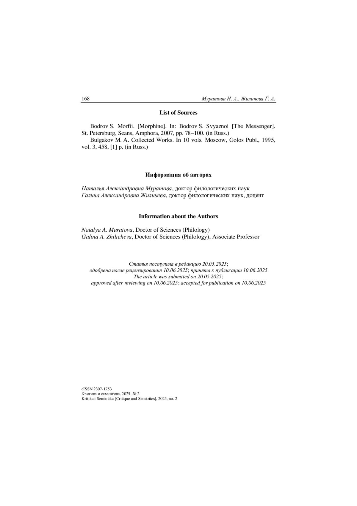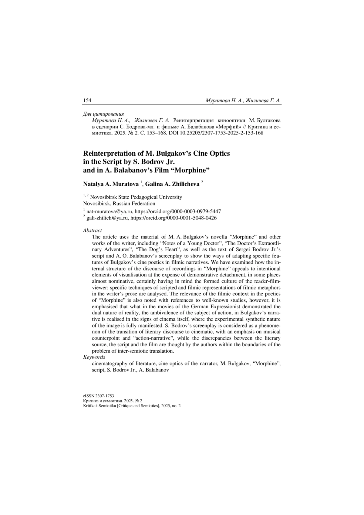 МУРАТОВА Н. А., ЖИЛИЧЕВА Г. А. РЕИНТЕРПРЕТАЦИЯ КИНООПТИКИ М. БУЛГАКОВА В СЦЕНАРИИ С. БОДРОВА-МЛ. И ФИЛЬМЕ А. БАЛАБАНОВА «МОРФИЙ» // КРИТИКА И СЕМИОТИКА. 2025. № 2