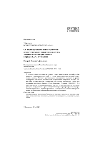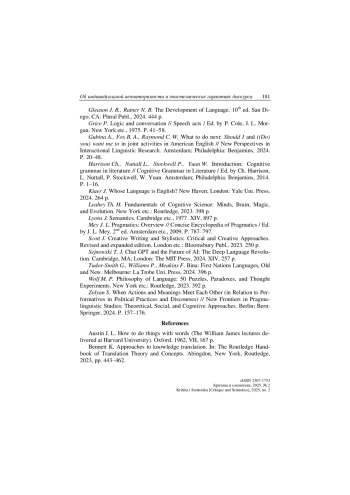 2. Демьянков В. З. Прагматика эпистемических гарантий реального, возможного и вероятного в дискурсе // Слово.ру: балтийский акцент. 2025. Т. 16, № 2. С. 13-27.