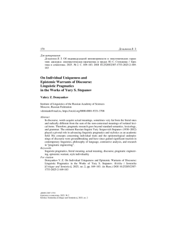 В дискурсе слова получают актуальный смысл, иногда очень далекий от буквального и радикально отличный от суммы внеконтекстных значений лексических единиц. Поэтому прагматическое исследование выходит за рамки стандартных семантики, лексикологии и грамматики. Огромный вклад в становление лингвистической прагматики как научной дисциплины сделал выдающийся российский филолог Юрий Сергеевич Степанов (1930–2012). Его идеи, связанные с индивидуальными чертами и эпистемическими основами дискурса, опередили свое время и получили широкое распространение в современной теории языка, в философии языка, в контрастивном анализе и в практических разработках в области «прагматической инженерии».