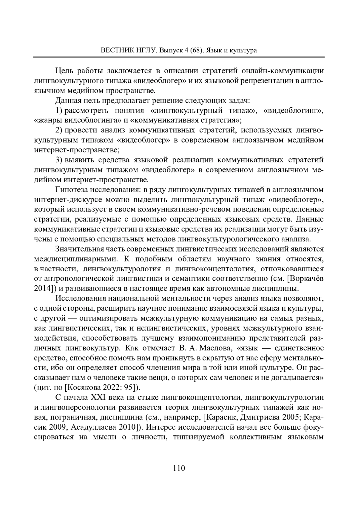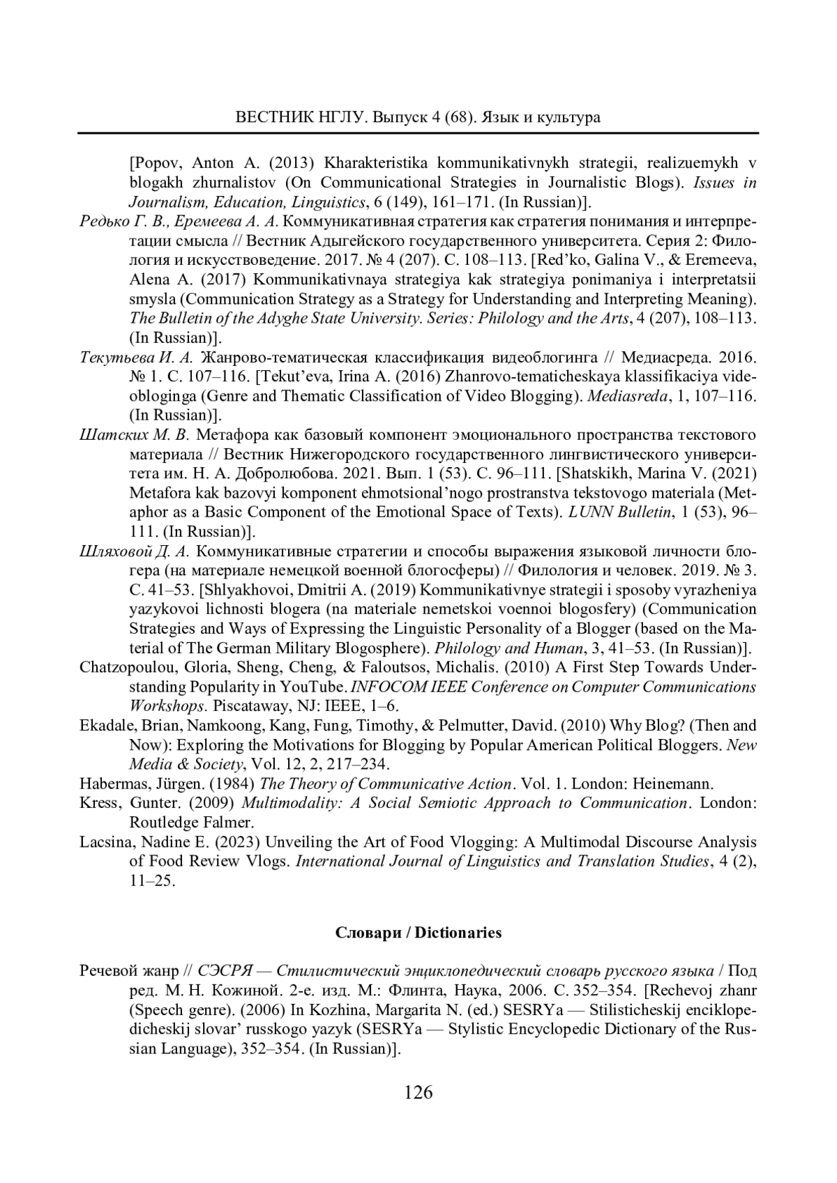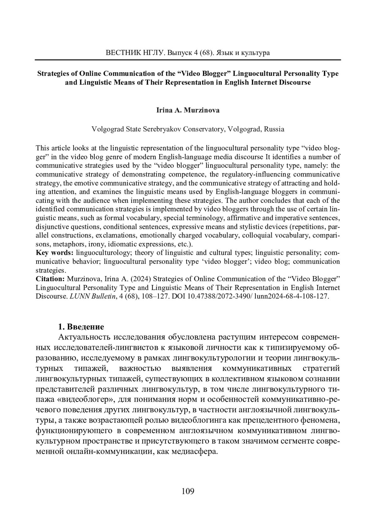 17. Мурзинова И. А. Языковые средства реализации стратегий онлайн коммуникации лингвокультурным типажом “видеоблогер” // Известия Волгоградского государственного социально-педагогического университета. Филологические науки. 2023. № 4. С. 45-55. EDN: QNJZOA