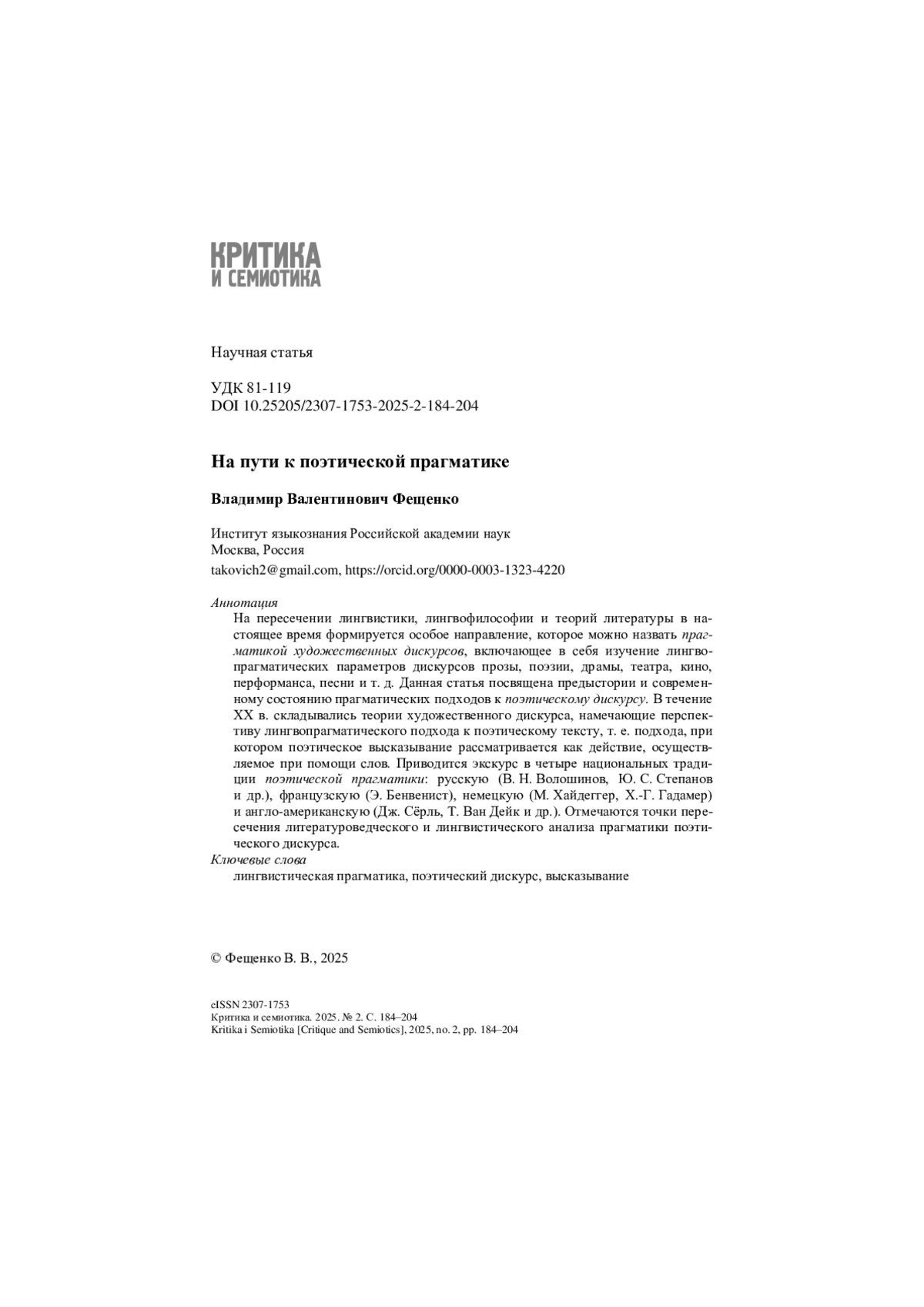 17. Фещенко В. В. Из истории когнитивно-лингвистических подходов в отечественной и зарубежной поэтике // Критика и семиотика. 2019. № 2. С. 95-112.
