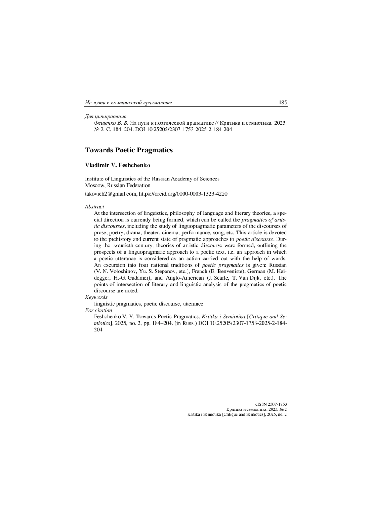 16. Фещенко В. В. Эмиль Бенвенист - теоретик поэтического дискурса // Критика и семиотика. 2018. № 2. C. 226-237.
