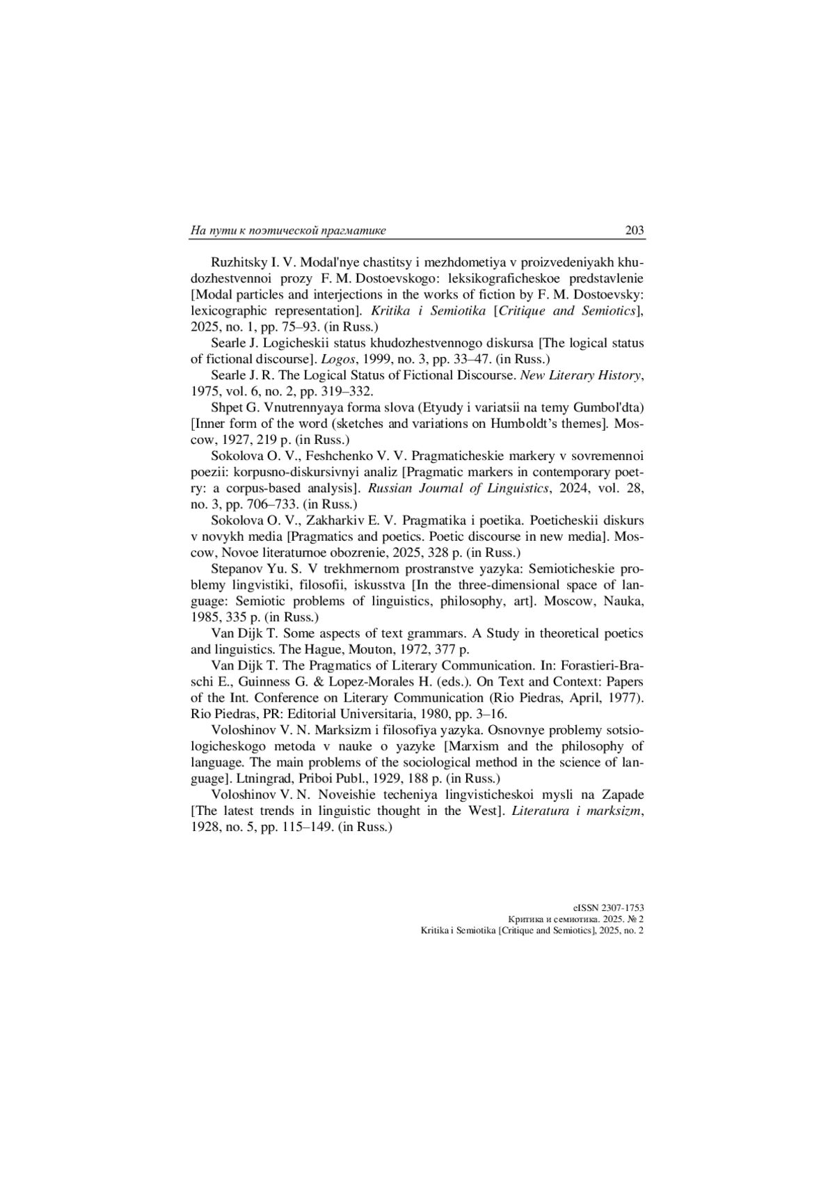 14. Соколова О. В., Фещенко В. В. Прагматические маркеры в современной поэзии: корпусно-дискурсивный анализ // Russian Journal of Linguistics. 2024. Т. 28, № 3. С. 706-733.